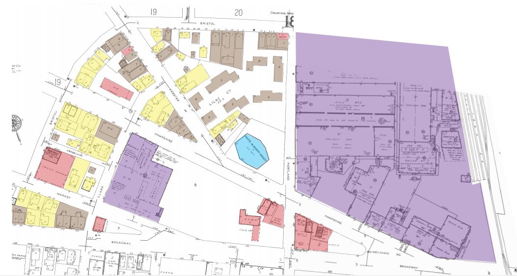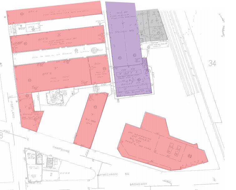 In terms of female land ownership, two names in particular stand out. Alex Dickenson owned mostly undeveloped land which would become the Boston Rubber Company. Slightly outside of my site lies Dickinson Street, which could’ve been named for the same family name. Mrs. Alex Dickenson, held a claim to the small plot of land between Broadway and Hampshire, of which was already fully developed as a machine shop. It seems that the Dickenson’s had a considerable amount of influence, so perhaps it is not so surprising that a female constituent of the family should also own land. A similar case can be said for the Sanders family. However, in this case, the female landowning name appears more than its male counterpart. It seems that the Sanders name is one that carries a lot of weight, but perhaps the land simply flows from female owners to male inheritors.
