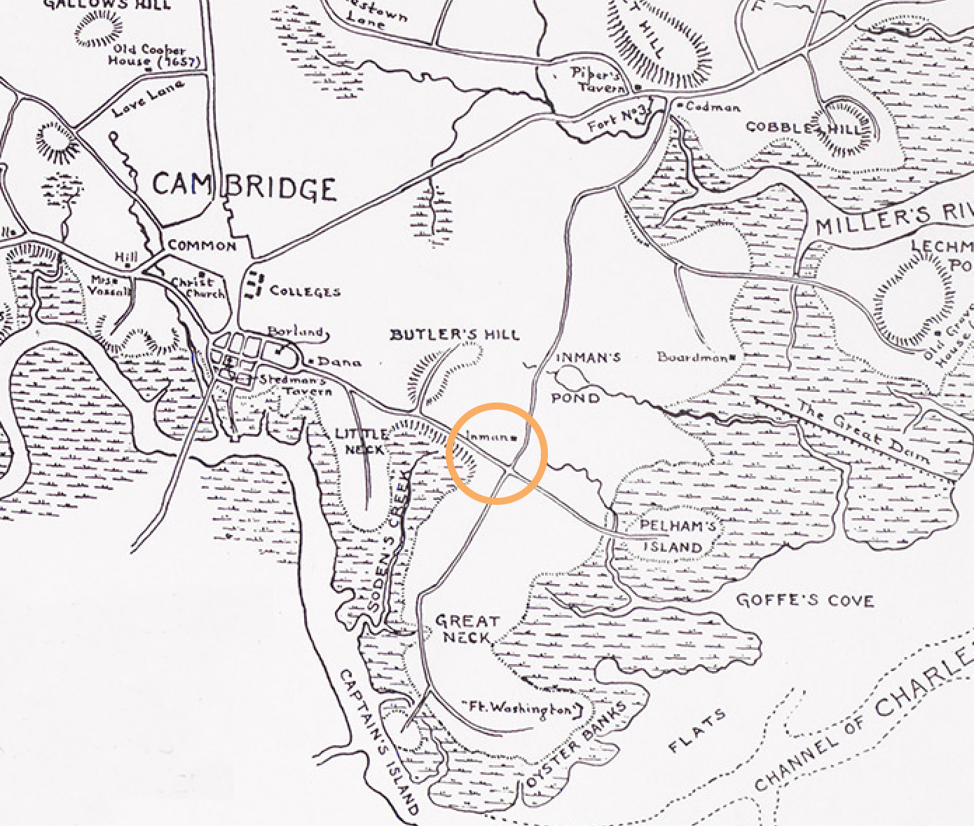 Close to the beginning of the revolutionary war, the Inman family fled Cambridge and their mansion was used to house patriot troops and the headquarters for General Israel Putnam (Waymarking). Its likely that after the American Revolution, some of the first settlements in Cambridge grew up around that area because of the easy access to roads and familiarity with the region. And the General Putnam Mansion remained an important figure in the region until way into the 19th century, as viewable on 1865 map (Figure 3).