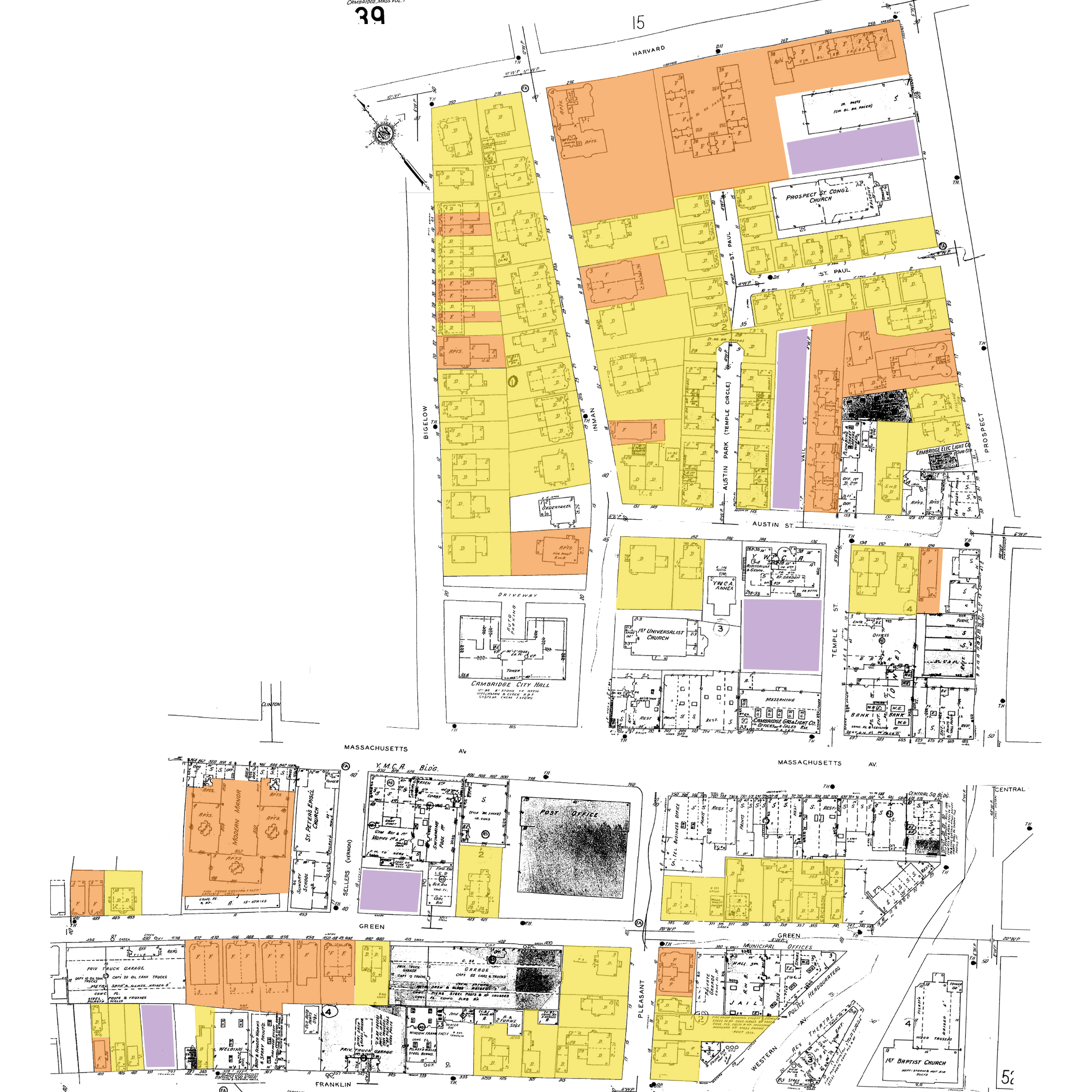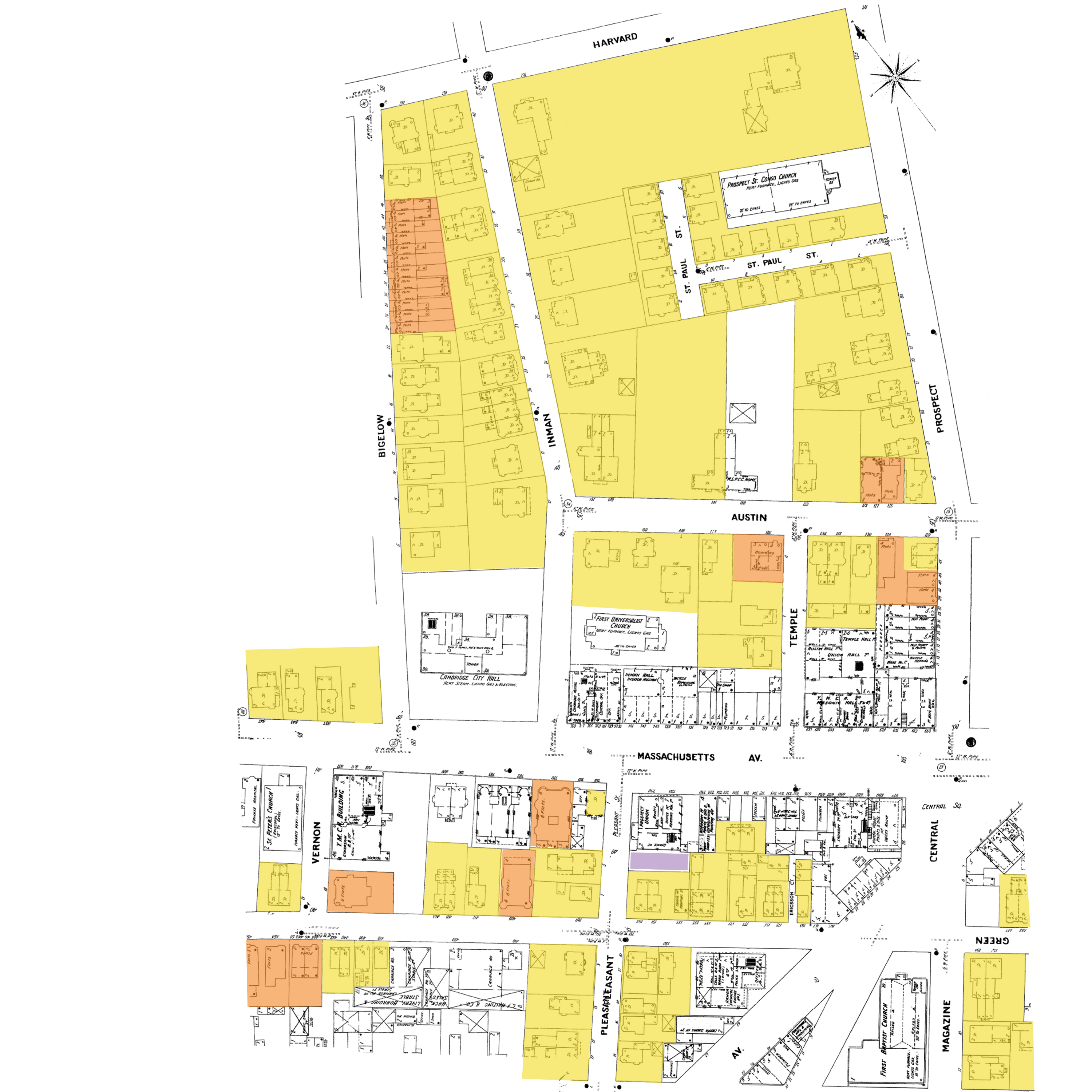 These changes can be seen best in the residential neighborhood that surrounds the commercial area on Front Street/Mass Ave. While the land was fairly developed as early as 1873 (Figure 5) with a mixture of single family homes, duplexes, rowhouses, and some slightly larger estates, density in the area increased fairly steadily throughout the next half century. In the 19th century, with few exceptions, most properties in my site are owned by individual owners and not rented out. This trend is broken however, when by 1900 Saint Paul Street is constructed and what was once a very large single family property gets turning into seventeen single family dwellings on a new inlet off Prospect Street (Figure 11). These homes are not much smaller than the average home on Inman and Bigelow Streets, but the increased density is indicative of increased property values as more people move try to move to the central square area. This trend continues and by the 1930s, even within the same block, two more similar inlets are constructed off Austin Street, Austin Park with larger single-family dwellings similar and Vail Court with more cramped stacked flats, as well as three larger multiple-story apartment buildings on Harvard Street, as seen on the 1934 Sanborn map (Figure 12).