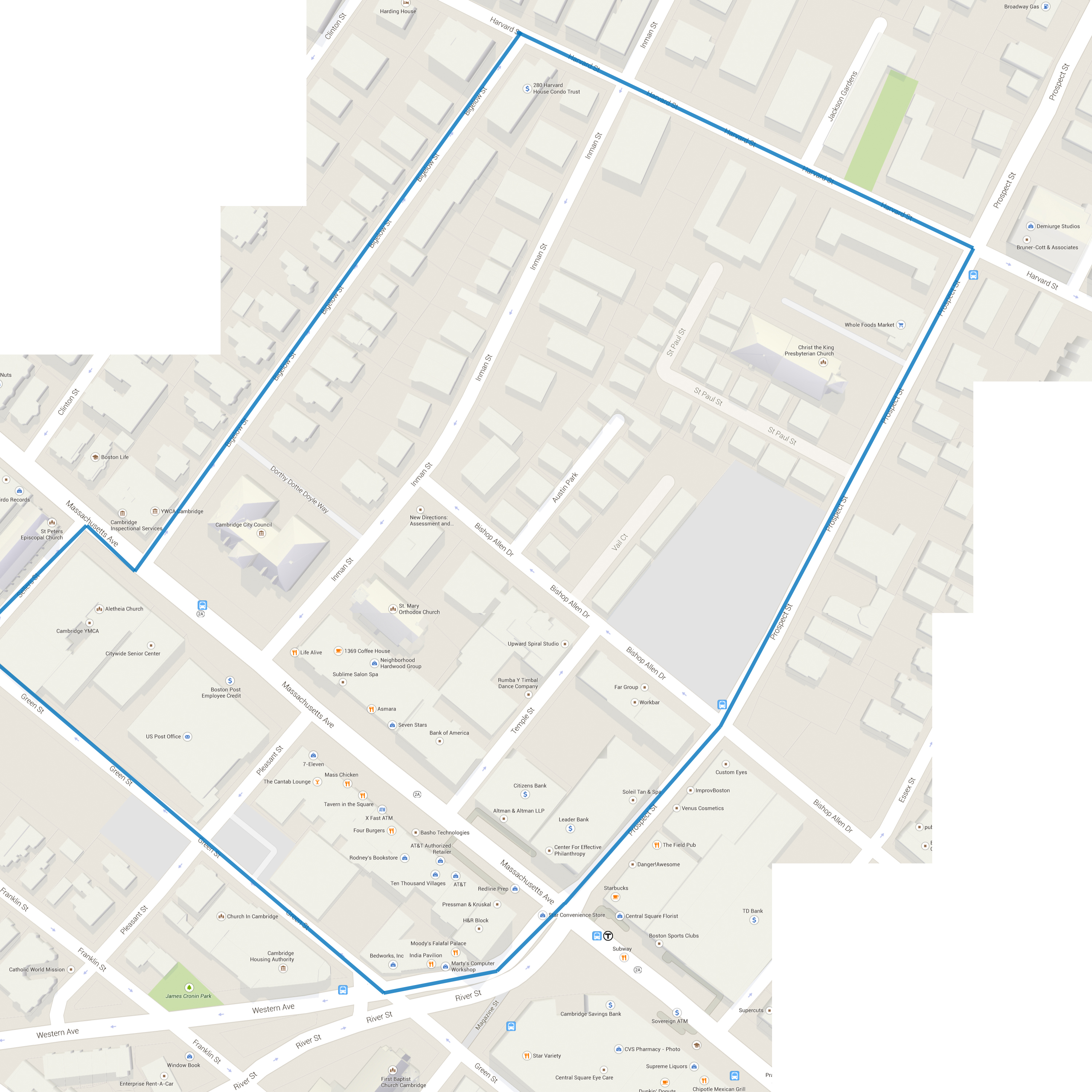 Although the are has gone through some ups and downs, the core of the district has stayed remarkably similar over time. Many of the things that make Central Square beloved to the people of Cambridge can be traced back to its routes––from the beautifully ornate historic churches and institutional buildings in the area that were the first keystones in the area, to the street layout that derives from the need to connect the original settlements while avoiding certain natural geographic features, to the delicious ethnic restaurants that are synonymous to many with the square that likely stem from the diverse immigrant population in the area.