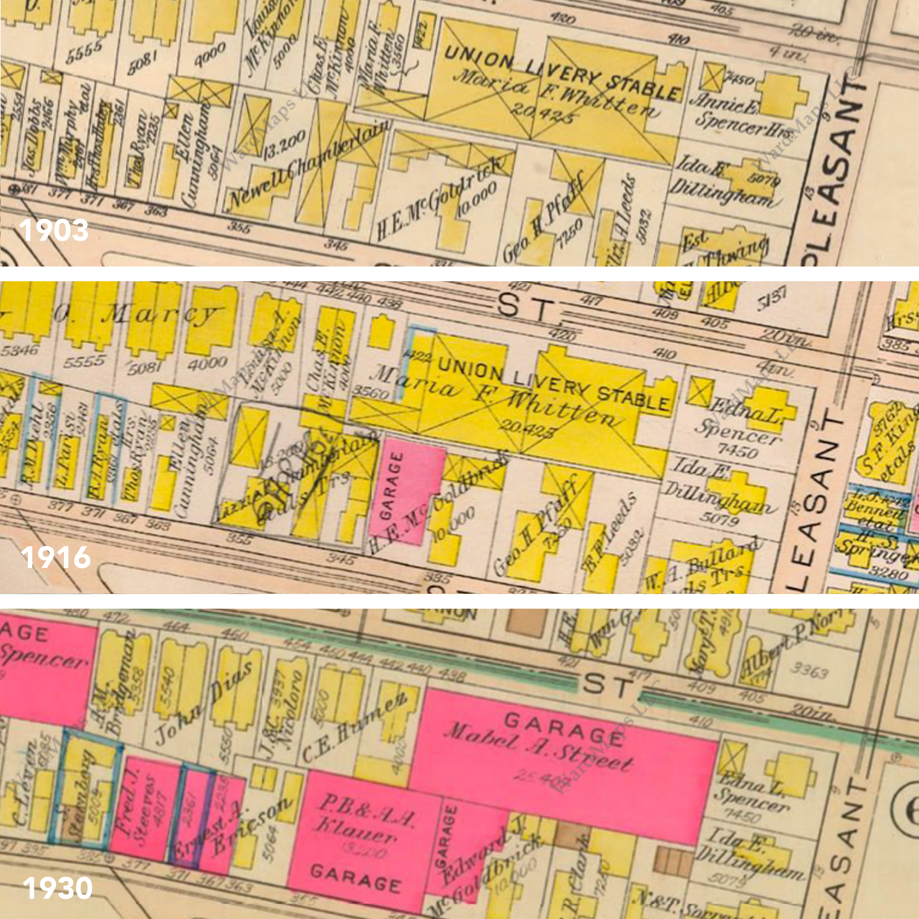 While Community and Civic buildings were thriving in Central Square, the majority of Cambridge’s growth was in residential housing (Jackson, 21). Public transportation came to Cambridge in 1824 with the opening of horse drawn omnibus services to carry passengers into Boston, as seen in the can see 1865 map (Figure 3). Then in 1853 the Grand Junction Railroad opened and ran across the marshes from East cambridge through Cambridge Port (also in corner of Figure 3. And in 1912 the Boston Subway system was extended to Cambridge, with one of its most heavily trafficked stops right in Central Square (see tracks in 1930 Bromley map, Figure 9). These ever-improving public transportation systems helped to maintain and modernize Central Square’s importance as an accessible center of travel and activity. And, of course, the quick spread popularity in the early 20th century of the automobile and affordable Model T as an efficient form of private transportation even further increased the ease of accessibility between Cambridge and Boston (Timeline). On the Bromley Maps, you can clearly see the transition from Stables and bike repair shops to Garages and auto body shops around central square (Figure 10).