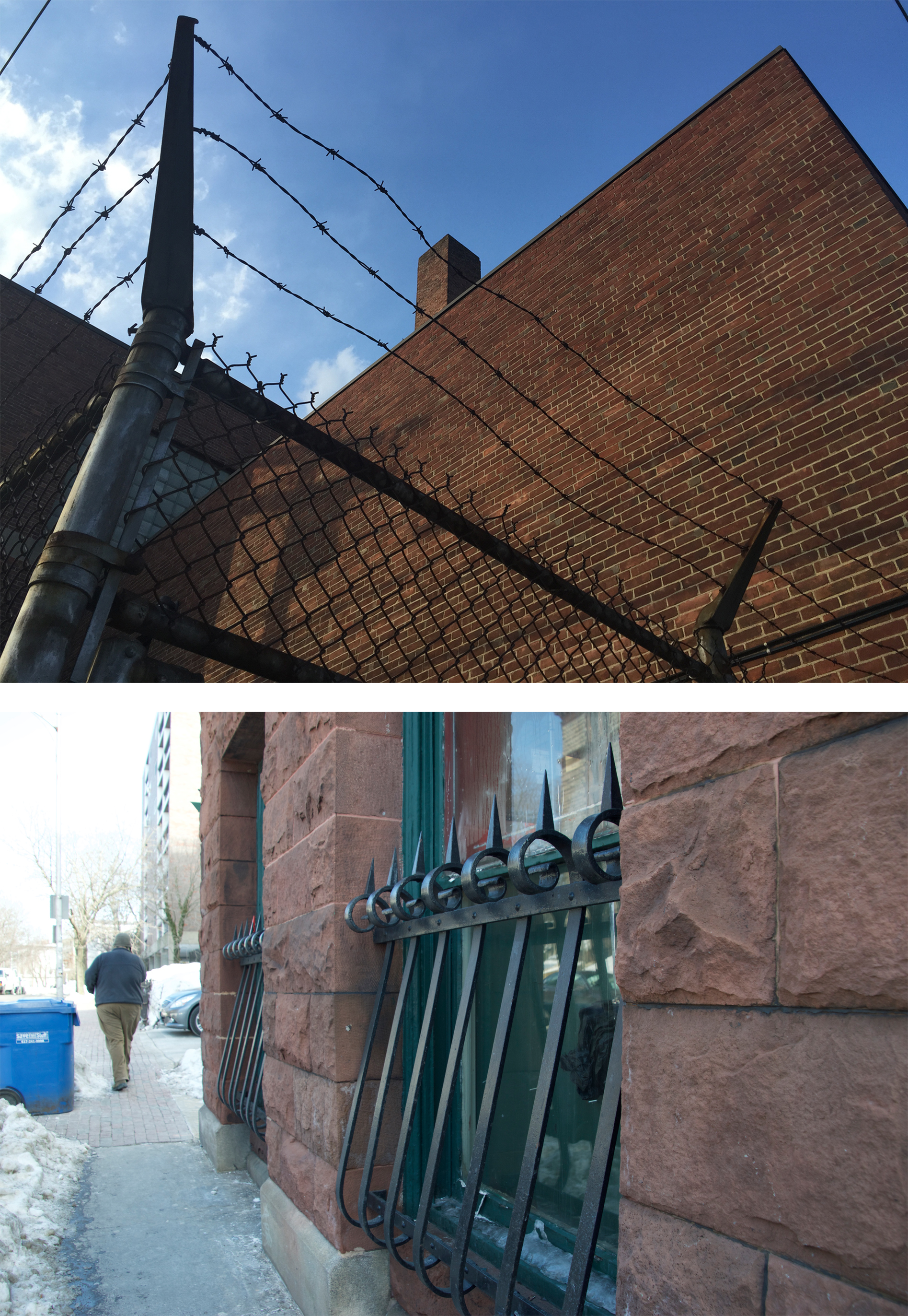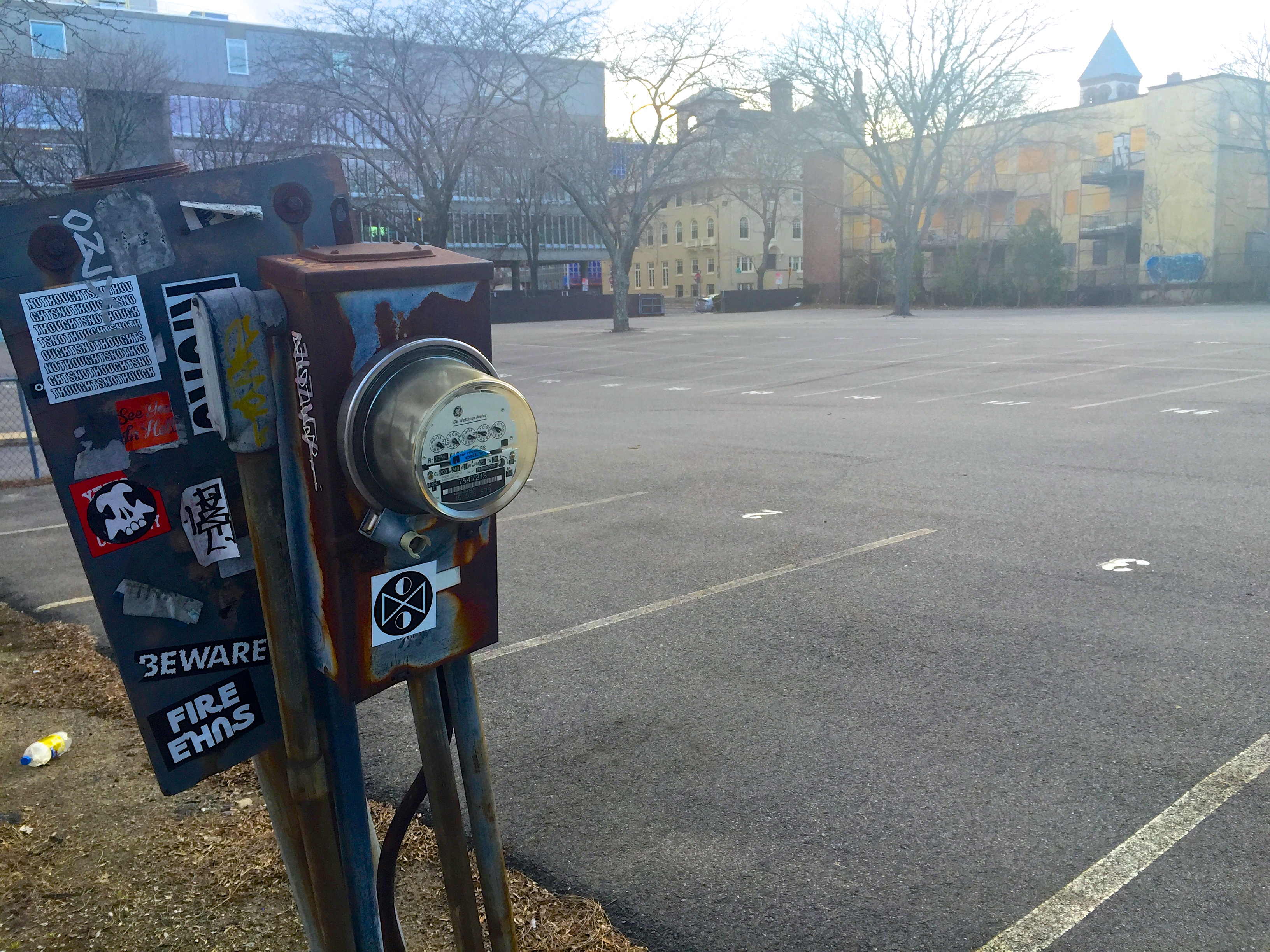 In addition to the building uses themselves, there are smaller details and overall patterns that permeate throughout my site that point to a trend of worsening of conditions, safety, and value. No trespassing signs and security cameras are all too common (Figure 14), even in neighborhoods, indicating that loitering “undesirables” are common in the area. Furthermore, barbed wire, such as seen on the fence behind the YMCA, and railed lower windows, as seen on the Guaranty Trust Building, suggest that crime and theft likely are (or have recently been) an issue as well (Figure 15). My site also has an overabundance of parking lots that show that the property is underutilized. Most of these lots are never full and seem to just be holding space until the owners view the property as worth redeveloping. On Prospect Street there is a very large parking lot that used to be home to a wide array of commercial, residential and public-serving buildings. Yet those buildings were all demolished by the 1980s and now the only trace of what stood before is a utility meter that stands by the sidewalk with no building attached (Figure 16).