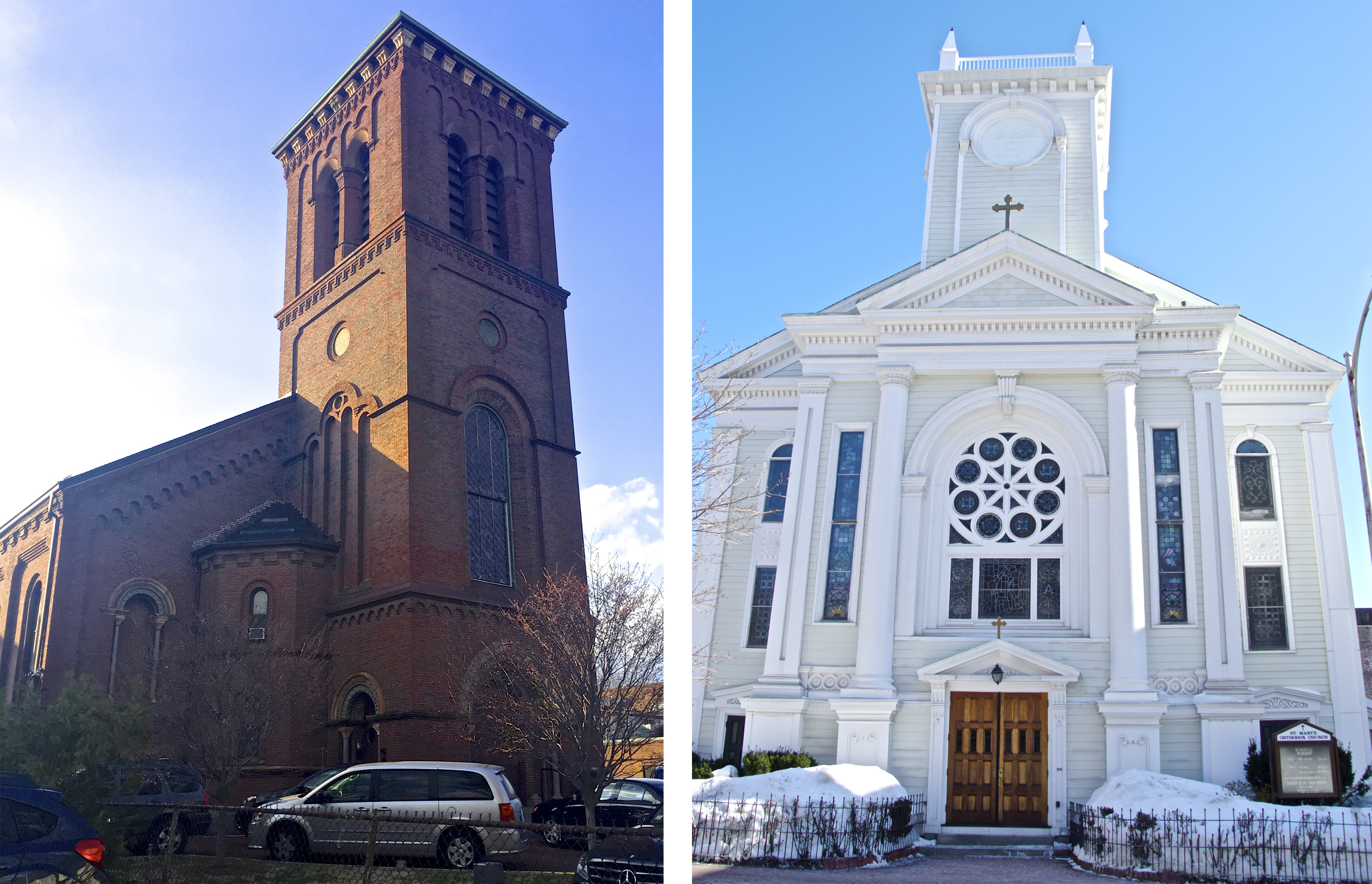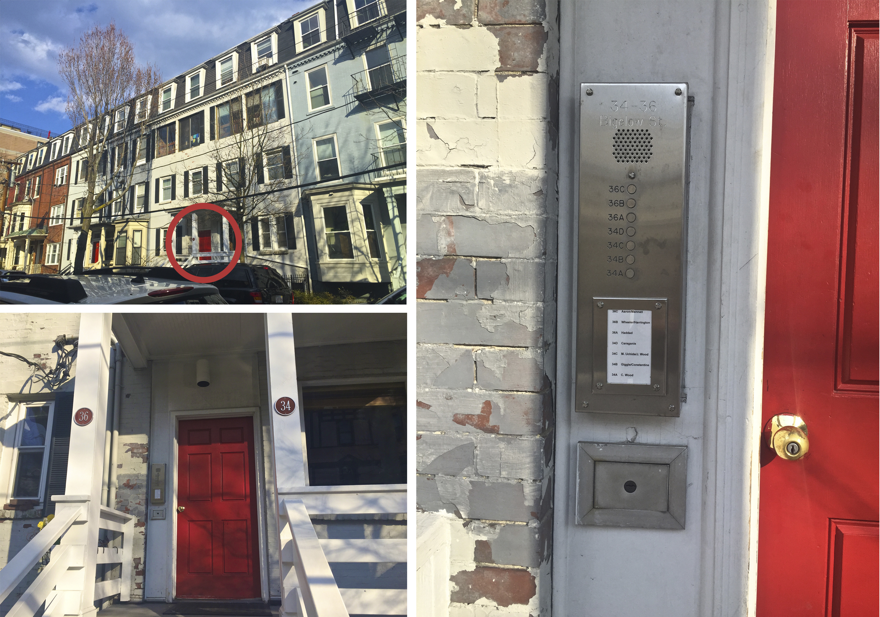 In residential districts some of the most obvious signs are large single-family houses that have over time turned into multi-family apartments. For example, at 22 Bigelow street (Figure 8), a large house that once belonged to a large family now has eight different mailboxes and eight different utility meters revealing that the demographics of the neighborhood underwent a transition from single-family homeowners to more dense, lower-income apartment renters. Similarly, at 34 and 36 Bigelow Street (Figure 9), two separate street addresses share a single door and house seven separate tenants, implying that the house may have gone from a single-family home to a duplex, to an apartment building. Furthermore, the paint on both houses is chipped, implying a decrease in maintenance over the years.
