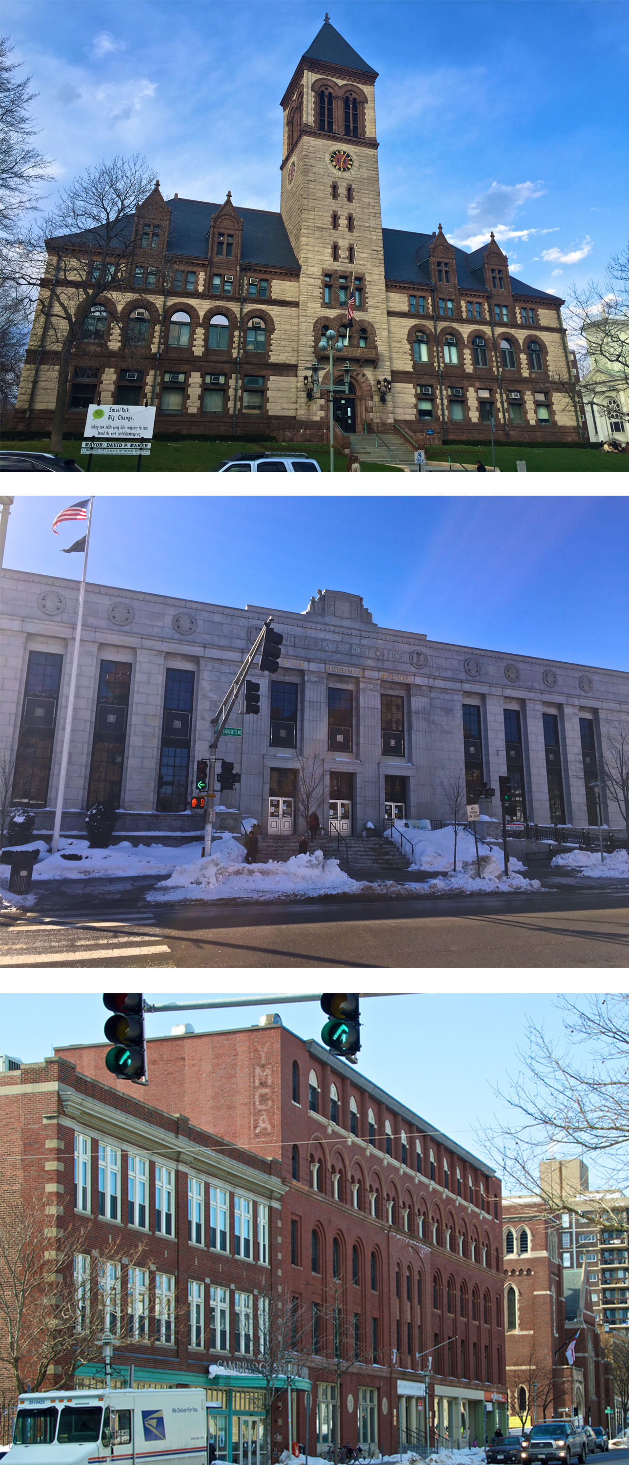 At the center of my site lies one of the most important and iconic buildings in the area, the grand Cambridge City Hall. Across the street is the Post Office and YMCA (Figure4). This cluster of old buildings is an artifact of a time when Central Square served to unite the people of Cambridge and shows the important role my site has played over time as a center of political and public serving resources. These buildings have also been fairly well preserved over the years, demonstrating the value that the city and it’s inhabitants place on maintaining their historic character and grand presence.