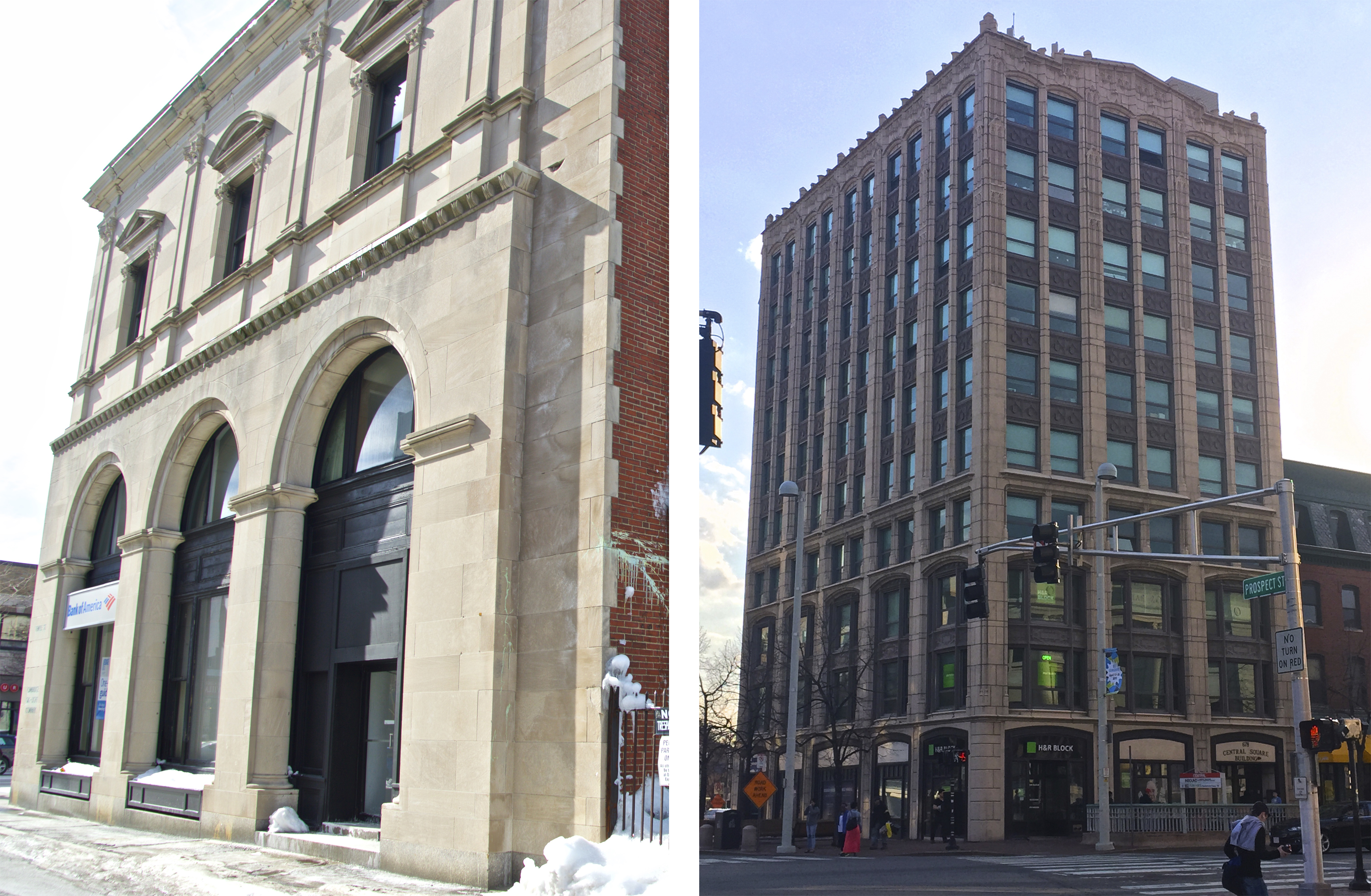 Other kinds of old buildings also give insight into key aspects that were vital in the early development of my site. The Presbyterian Church on Prospect Street or St. Mary’s on Inman Street (Figure 5) are only two of the many churches in the area and have stood in the site for over a century. While the occupancy has changed over time, the buildings have remained a gathering point for the community and demonstrate the lasting importance of Christian religion to the neighborhood. And older commercial buildings around Massachusetts Avenue can tell the story of businesses and industries that were important to the center’s economic development. The Central Square Building (Figure 6) was the first “sky scraper” in the district and marks the growth of business in Central Square in the early 20th century. The Guaranty Trust Building (Figure 7) is one of the largest and grandest buildings in the area and was once a large bank and insurance company but is now made up of smaller shops and apartments. On the side of what is now a Bank of America and Convenience Plus hardware store, one can see the title “Cambridge Gas-Light Company” (Figure 6), another important industry in the early 20th century.