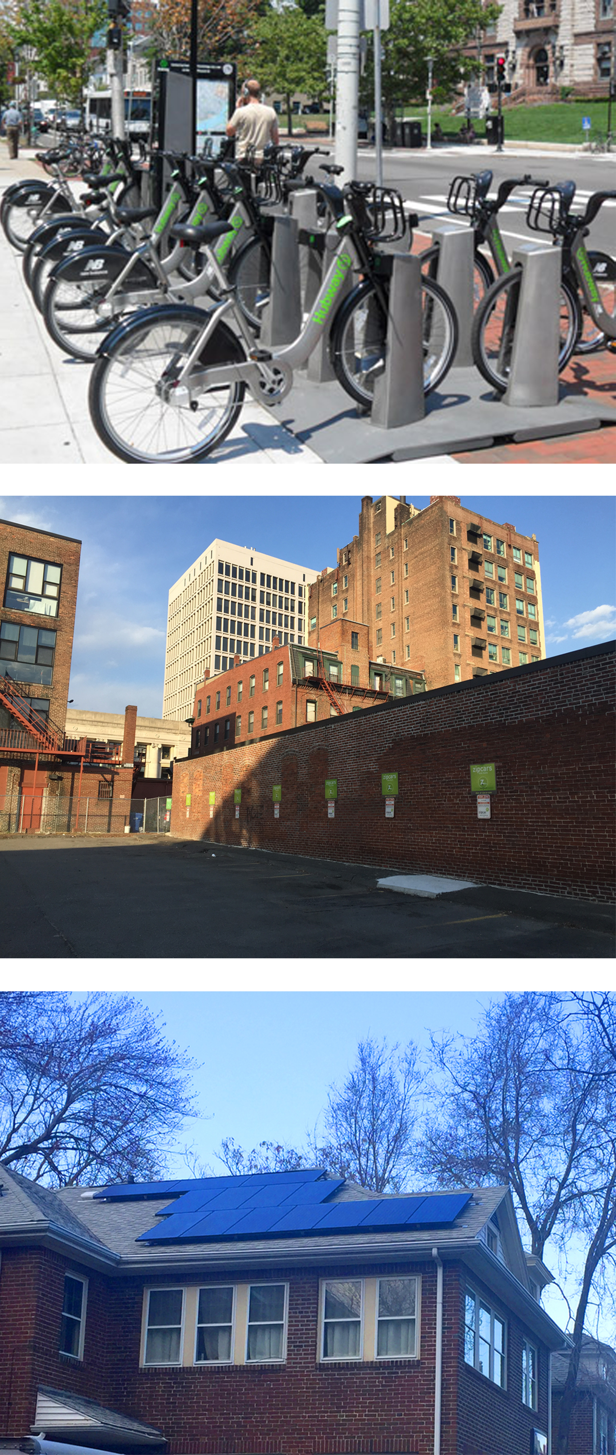 And this modernity of the rapidly changing 21st century extends beyond the storefronts. From 18th century roads, to streetcars to the subway system, Central Square’s place as a transportation hub has been a defining aspect of its development. Now the fundamental shifts in transportation that have occurred in recent years can also be found on my site. On Green Street there is a Zipcar parking lot and on Massachusetts Avenue there is a Hubway station (Figure 19). These new transportation systems illustrate the modern shift towards sharing and being more concerned about environmental issues. And movement towards greener living are apparent in other parts of the area as well. For example, an old home on Austin Park has been retrofitted with solar panels (Figure 19).