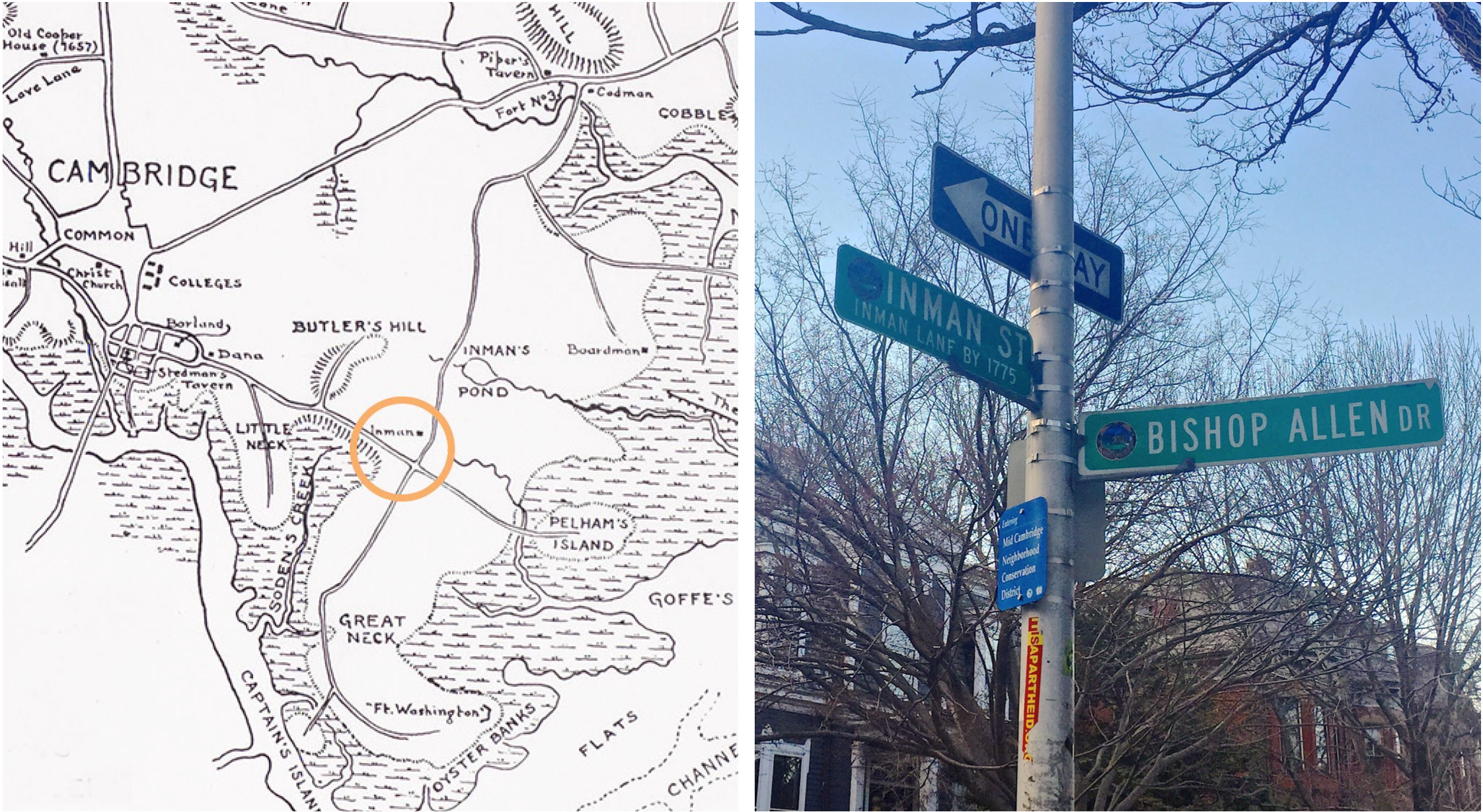 The grid street layout is one of the oldest parts of my site and has set the framework for development through the centuries. On the corner of Inman Street and Bishop Allen Drive, there is a street sign that quite clearly indicates the historic quality of the neighborhood (Figure 2). There is a blue plate that reads “Entering Mid Cambridge Neighborhood Conservation District,” showing that this block is not only old, but also conserved, valued, and protected for its historic characteristics. Above that, is the green Inman Street Sign that also notes “Inman Lane by 1775.” Inman Lane was the road that lead to the Inman estate, which during the Revolutionary War was used as a Military Base set on an important crossroads, as depicted in the 1777 map (Figure 2). While the original estate did not make it though the 19th Century, traces of its influence on the area can be detected today.