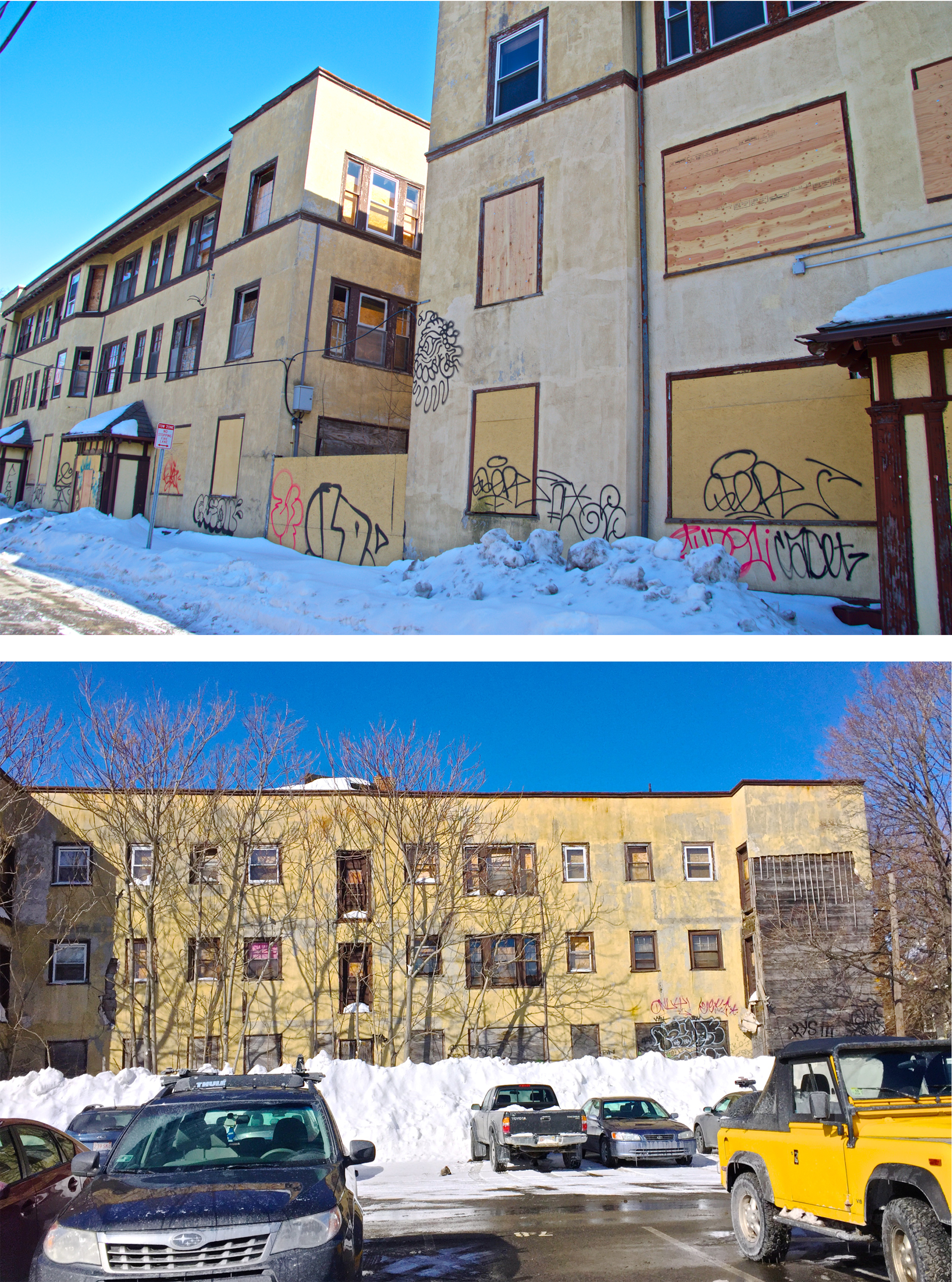 The most extreme example of this is Vail Court (Figure 11). Vail Court is an inlet off of what is now Bishop Allen Road and was the first apartment complex on my site. However, since its construction in the early 20th century, the two neighboring buildings have fallen into ruin. They currently sit with boarded up windows and graffiti on the walls and the lot is used only for parking, if at all. It is intriguing that such a derelict property shares a block with some of the highest valued properties in the area and implies that, likely due to economic challenges, the property owner has not yet seen the value of redevelopment or sale.