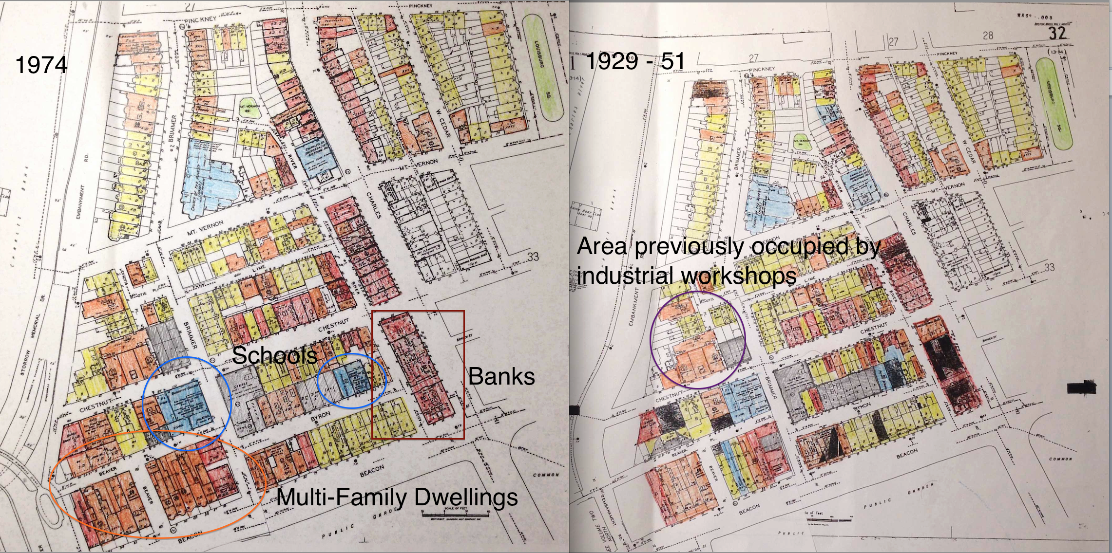 As explained in previous sections, multi family dwellings start to replace single family towards the end of the nineteenth century as a speculative economical incentive of those who aimed for the rise in real state costs in Beacon Hill. However, the Great Depression and post-World War II baby boom enhanced this process in the first half of the twentieth century. As described by Warner, during the Great Depression “the well-to-do abandoned their houses in the Back Bay, the Fenway, and Beacon Hill, some moving into old summer homes in nearby suburbs. Their places in the city were taken by physicians offices, small efficiency apartments, and student digs” [2]. By looking at the 1929 – 1951 and 1974 maps (Figure 5) we can see how orange multi family dwellings substantially replace yellow single-family lots. Particularly in the area of the flat of the hill and the blocks facing Beacon Street, we see a high density of apartment buildings and offices (represented by some of the red lots). Furthermore, as factories in the central cities were replaced with banks, hospitals, clubs, and offices, the higher middle class working in these settled in the multi family dwellings in the Flat of the Hill. As seen in the 1974 map from Figure 5, schools, college buildings, and banks (as noted in the map) start appearing in the blocks in the Flat of the Hill bordering Beacon Street. Thus, the Great Depression and post World War II time frames enhance an economical change in the Flat of the Hill as the wealthy move to the suburbs and upper middle class populated the apartment buildings. However, regardless of these multiple factors of social and economical changes happening in Boston, the area of the south slope (Louisburg Square) remained unchanged.