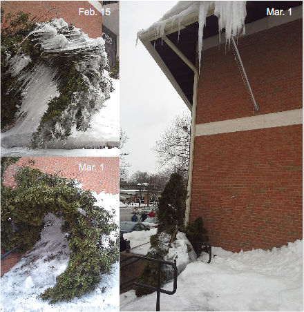 Figure 9: Tree at the entrance of the Italian Cultural Center, over the course of two weeks This tree was placed as an ornament next to the entrance of the Dante Alighieri Italian Cultural Center, completely ignoring that it was directly under the eave at the south-west of the building, which in general is prone to accumulating snow in the Boston region because all the nor'easters during the winter.