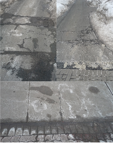 Figure 5: Fatigue cracking around the main entrance of the park. Note the pool of ice forming between the sidewalk and the road, just as the crack is propagating through the cement. Also note the potholes that seemed to have been filled on the top left image.