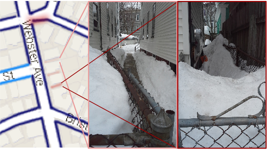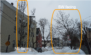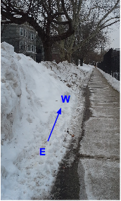 Figure 2: Gradient of snow along York St, from east to west, decreasingThere were several ways of qualitatively identifying wind patterns on the site, when considering its relation to the deposition of snow. As can be seen on Fig. 1, there were two distinctions made for wind: in red is the presence of wind, shown with arrows, and absence, shown by crosses, as it was physically felt on the site; in orange, the overall direction of wind, from the northeast, during the winter storms that have been taking place over the past month is shown. These two instances can be correlated since the visits made to the site were during the start or end of the winter storms, indicating continuity in the wind pattern. These findings are supported by both the presence of snow throughout the area and the knowledge of wind behavior. In the case of the snow, one can assume that even though the snow observed had been moved by snowplow or shovel, the distance it was moved was minimal. If anything, it was pushed to the side of the street but not moved towards a particular side of the street. Thus, gradients in snow accumulation were clearly visible and could be quantified, and were indicated on the map (Fig. 1) by an increasing redness for an increasing quantity of snow. Similarly, this behavior is supported by an explanation of wind patterns, as presented in Granite Garden. Over a city, winds will slow down over the buildings because of the friction presented but speed up if coming across an open space like Donnelly Field, which is to the north-northeast of the area studied. Since the buildings are all of similar height around the field, the funneling of the wind into the streets will simply depend on the direction of the wind and streets, and not on a tall building pulling stronger winds down to the ground for example. When wind comes into contact with a building, it will actually split off into branches: one slowing down while going over the building, meaning that a reduced speed will dump snow behind the structure; two going around from each side increasing speed; and another going down to the base of the building upon initial impact, clearing the snow. So, in the case of York St, on the western side of the street the snow was cleared by the full force of the wind, whereas the eastern side came into contact with a slower wind that was coming over the building and not the open field, whereby it received a lot more snow (Fig. 2). Other examples of wind losing speed and dumping the snow it was carrying were along Webster Ave by Seckel Street, and at the intersection of Plymouth and Hamlin St (can be seen on Fig. 1). The second intersection is a case where the wind changed direction and an eddie, or area of reduced speed, was created. This could also be seen with the houses along Webster Ave that backed a courtyard: by all having an orientation towards the south-west, these houses were all prone to create eddies when in contact with the wind; however, the speed of the wind must have been related to the surface of courtyard it covered, since as the free space the wind covered increased, the more snow was accumulated in between the houses (Fig. 3). Thus, the presence of buildings has deeply affected the natural movements of wind in this area, by diverting and concentrating its course.