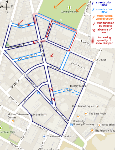 Figure 1: Diagram of site, overlayed on Google Maps document, where the highlighted streets indicate the boundaries of the site. The color red is used to demonstrate the presence and absence of wind (by arrows and crosses, respectively) but also the gradient of snow since there is a direct correlation of quantity and presence of snow with the wind patterns.