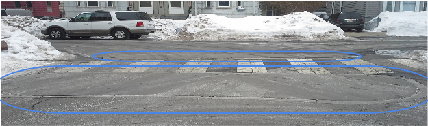 According to Elkins, “fatigue cracking” like the one that can be seen Fig. 5 can be caused by overuse and bad drainage, which both seem probable. Bad drainage is currently taking place with the quantity of snow on the street the drains being covered by the snow and ice, and the fluctuating temperatures causing the snow to melt and form into ice. Overuse is also a possible cause since York St is the fastest way to get around the field back to Cambridge St, which has a lot of traffic, but also because all of the houses along York St seem recently built, which would indicate the passage of trucks in the area for construction purposes. Before the field was put in place, in its stead were several blocks of housing, demolished between 1874 and 1898. A possible indicator of a different use of land in the area is Depina Sq, the western corner of the field with Webster Ave. There were two oval cement rings in the ground that were filled with cement at some point recently, in the middle of the intersection. From how they were disposed towards one another, these could have once been the location of flowerbeds (Fig. 6). But most importantly, the junction of the streets point towards the existence of an actual square that then needed to be converted into a more efficient street once traffic was diverted into York St. In this way, there is visibly a back and forth between the man-made elements inserted in the natural environment having an effect upon it, and the natural environment changing the new elements.
