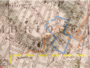 Figure 4: Overlaid maps, where the background is the topographical maps, and the overlaid drawing is the 1776 version. In orange is the topographical line to indicate 10 feet in elevation and in light blue is the boundaries to the site. Note that Seckel St was unfinished at the time.