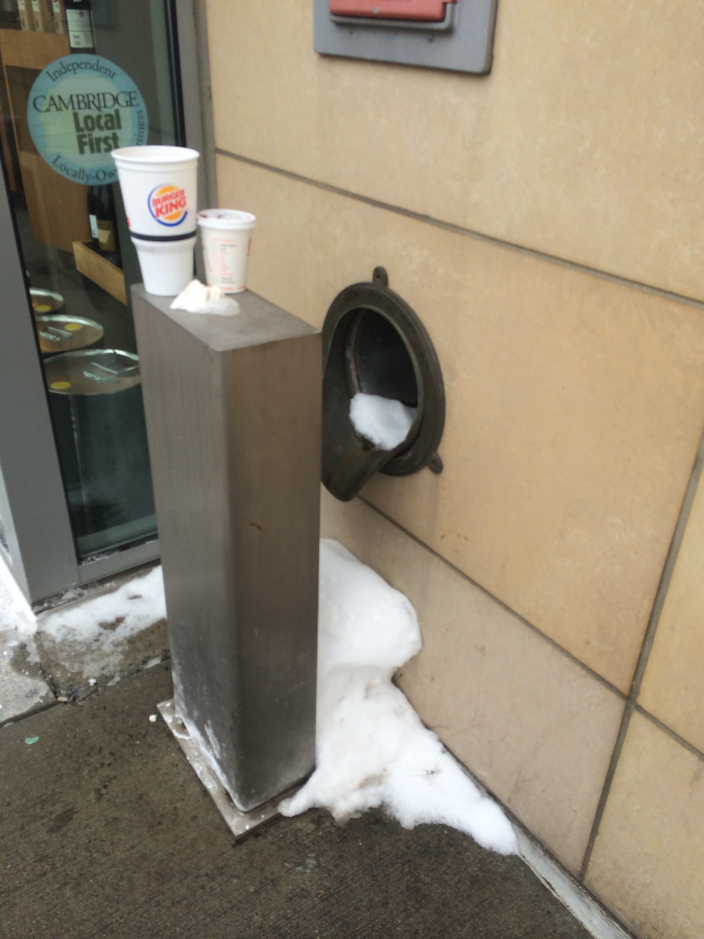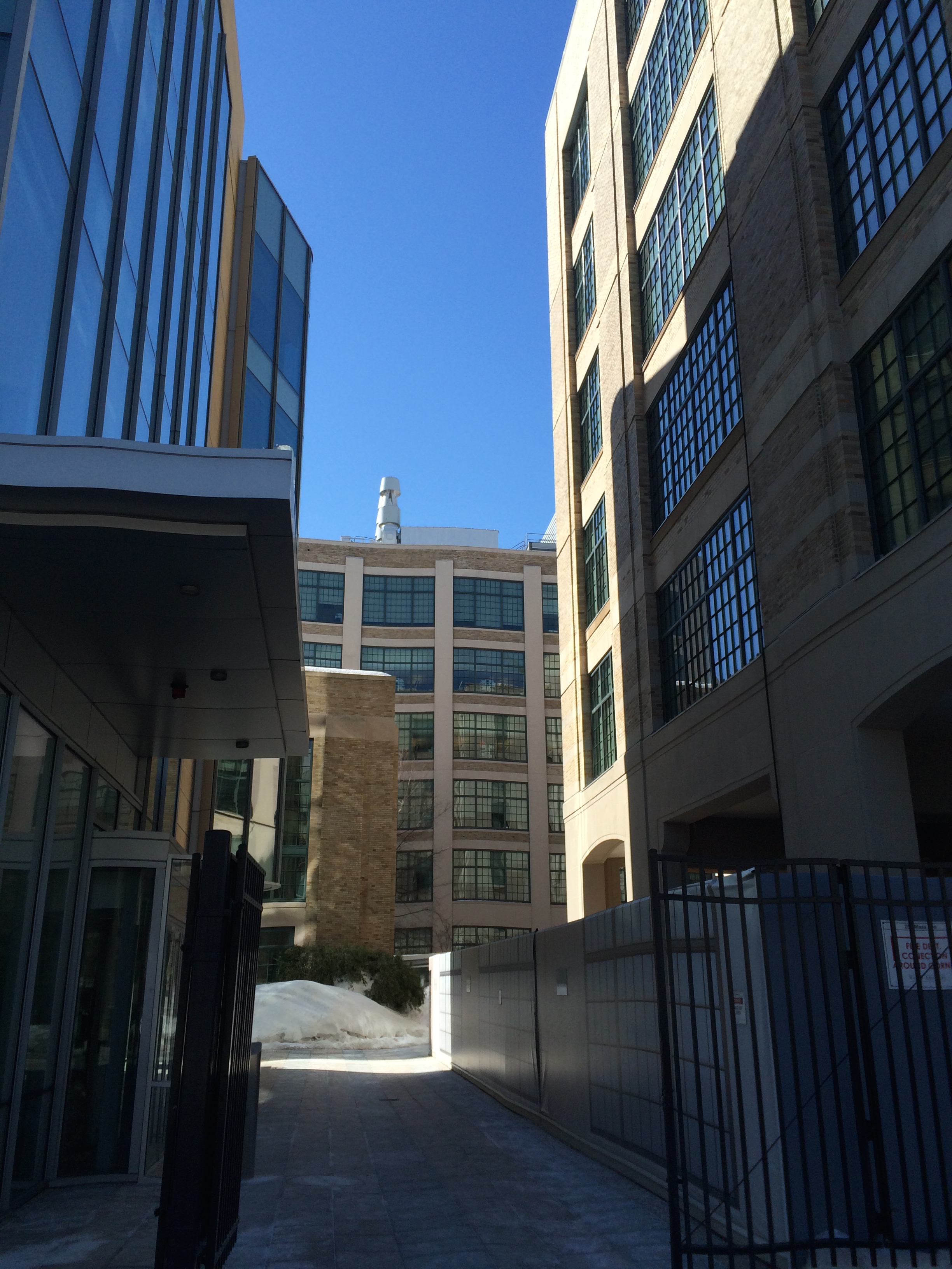 How do we accommodate for the flow of water through a city? Spirn addresses this in her chapter on water, saying that instead of diverting storm water, it can be stored. Rooftops, parking lots, and parks can be designed to store rainwater and gradually allow it to percolate into the ground without adding an additional volume of water to the natural storage capacity of the ground in surrounding areas (Spirn 145). The aforementioned downspout with the bollard is on the Novartis Institutes for Biomedical Research building on Massachusetts Ave. This building actually has a central courtyard that, although it only has a few trees arranged in a minimalist fashion, can be considered a green space (Fig.7). I see this courtyard as a potential solution to the large amount of rainwater that accumulates on the building’s roof. The courtyard could be turned into a system for storing storm water in an aesthetic manner by incorporating slow-draining paving systems, more absorbent plants, water features, and creating a rain-fed irrigation system for the plants. Fresh water distribution and storm water management pose a significant challenge to large cities, but through innovative, environmentally conscious design, buildings and cities can use storm water management as an effective way to steer towards sustainability.