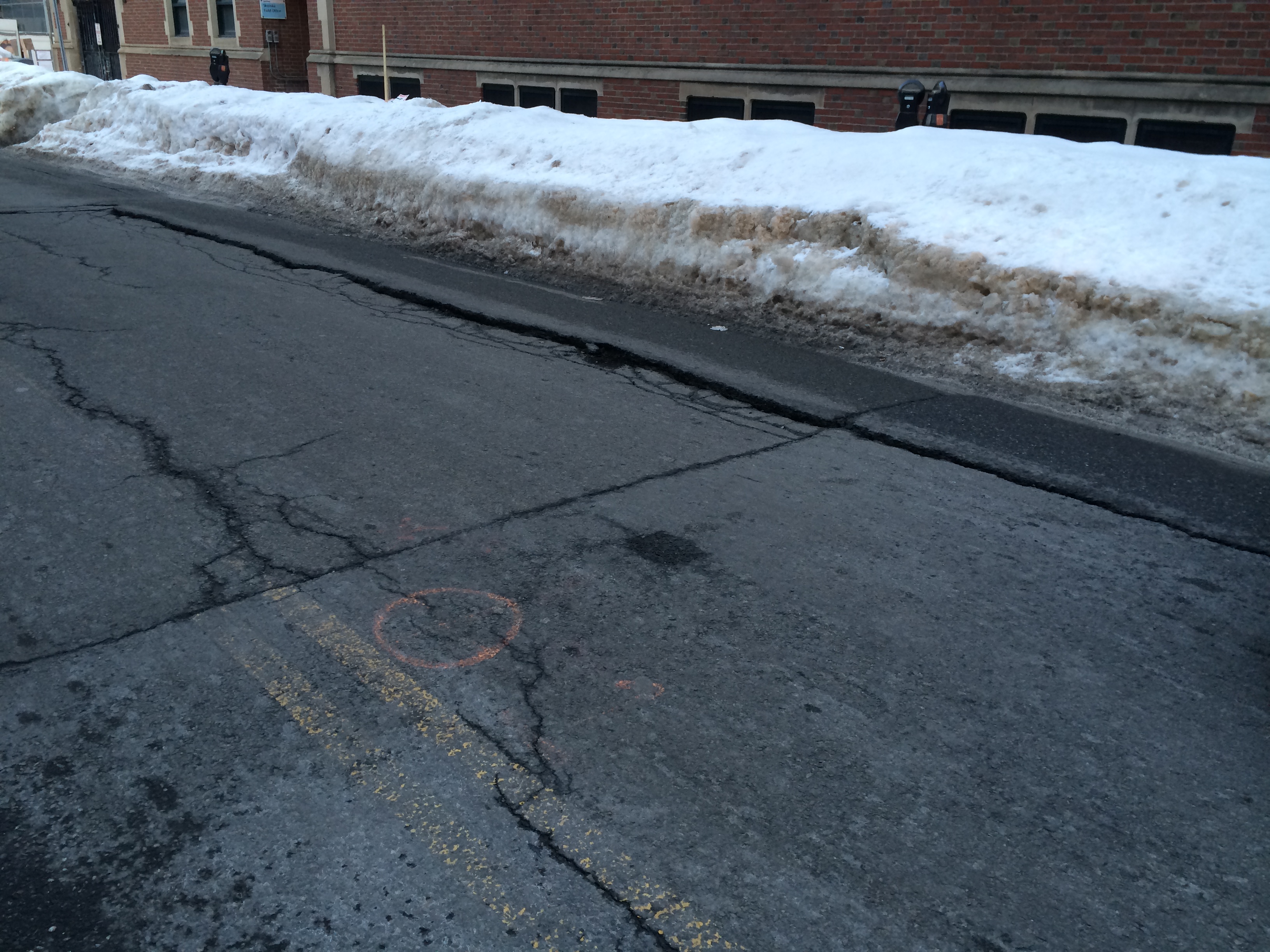 Human activities exacerbate the problem of settling soils under cities. My site is home to the construction site of the new Novartis headquarters, and sees a constant stream of construction vehicles, heavy equipment and construction workers every day. On Windsor St., which has become an access route to the construction site, the asphalt is cracked in two places longitudinally down the street. The distance between the cracks is the same size as the wheelbase of a construction vehicle and the region between the cracks is depressed about two inches (Fig.5). Again this demonstrates that when concentrated loads are applied to the soft soil it gives and in turn, the rigid structure on top of it cracks. These instances of settling may not be particularly threatening to the city in comparison to earthquakes and other such disasters, however they can compound and add up to expensive structural and infrastructural damage. Spirn writes that every building, street, or other human construct in a city should be “designed to prevent/mitigate hazards and to conserve and restore resources” (Spirn 125). In designing a city or in a smaller community it is necessary to take into account its geological situation. Maybe non-rigid building materials should be used for roadways if the ground beneath is prone to settling. Maybe the very fact that a site is on less dense soil can be advantageous in designing green spaces where large tree root systems help to solidify the soil. A fluid base does not have to result in a failing rigid structure if the structure is designed to accommodate for it in the first place.