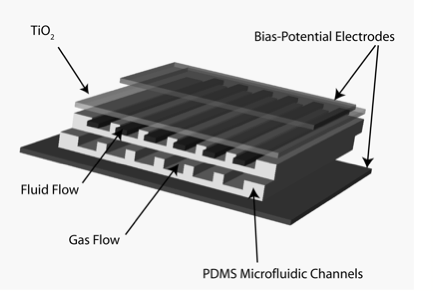 Concept model for integrated microfluidic photolytic oxygenation module. Multi-layer PDMS microfluidic channels are sandwiched between photolytic elements. The total thickness of the structure is on the order of several millimeters, meaning that multiple elements could be stacked back to back, achieving extremely high channel densities. |