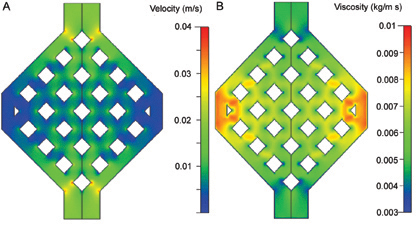Modeling of flow parameter such as pressure drop, fluid viscosity, and shear forces has also been applied to our artificial respiration project. The development of microfluidic devices designed to emulate physiological flow systems, such as the capillary microcirculation, has particularly stringent design requirements due to the need to maintain the viability of rather fragile red and white blood cells. Such microchannels need to incorporate a relatively small diffusive boundary layer to allow chemical efficiency while maintaining broad enough dimensions to minimize adverse flow conditions. As a basic, scalable building block to minimize damaging tangential shear forces, we adopted an asymmetrically configured microchannel network design. Using CFD, we simulated the flow of blood through the microchannel configuration, modeling both flow viscosity and flow velocity. From this model, we were able to develop a model that correlated microchannel dimension and volumetric flow rate with the percentage of blood hemolysis resulting from passage through the device that correlated well with experimentally fabricated modules (Ref 7).