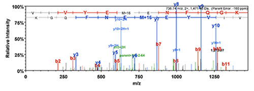 Scaffold .sf3 files contain the overall Scaffold results for proteomic data, and can provide a virtually complete summary of Spectrum Mill database searches, including % coverage, individual MS/MS spectra with y- and b-ions (and others) labeled, and fragmentation tables along with other information and views. These files can be opened in a free Scaffold Viewer (see link below). For a quicker, summary look, relevant MS/MS spectra themselves can be downloaded as a pdf.