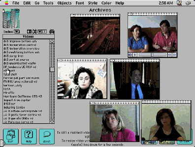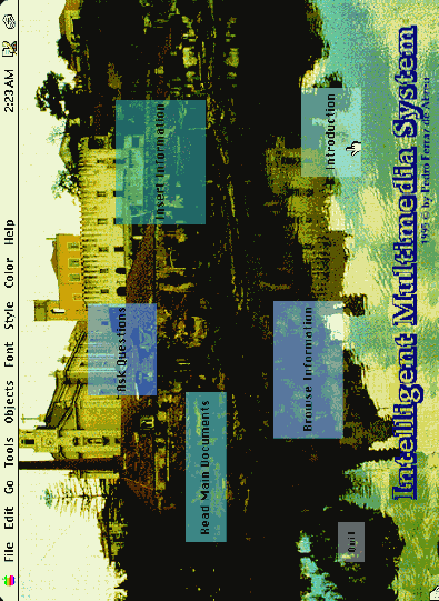 While not the focus of the project, the IMS prototype was designed having in mind to explore different modern paradigms of interactive user interface in computer programs: functional interface (direct access to program's functions), metaphoric interface (access through icons and images that evoke kinds or sets of functions and operations), direct object manipulation (e.g. "drag-and-drop", at the time in its early stages), context-dependent help, and multiple levels of complexity.