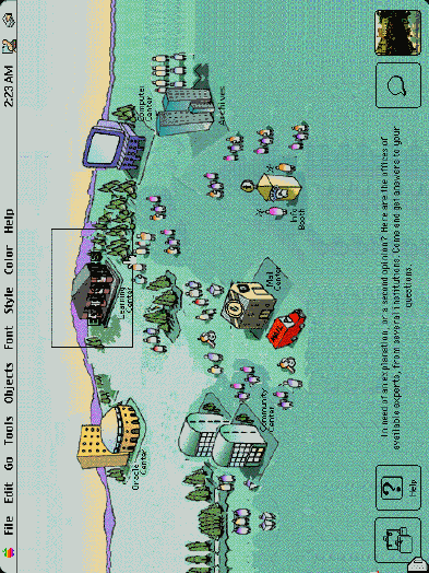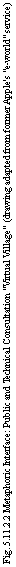 On the other hand, the main operational interface screen (Fig. 5.11.2.-2) uses the metaphor paradigm, mapping "virtual buildings" within a "public participation village" to consistent sets of functions, like the bundles of services that anyone expects to find in similar buildings in the real world.