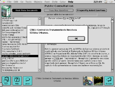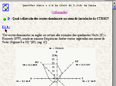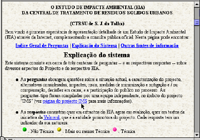 - Entry page at the FAQ Web site with trails("Welcome to the first experience of presenting in detail an Environmental Impact Assessment (EIA) on-line, through Internet, complementing the official public consultation. In this page...")