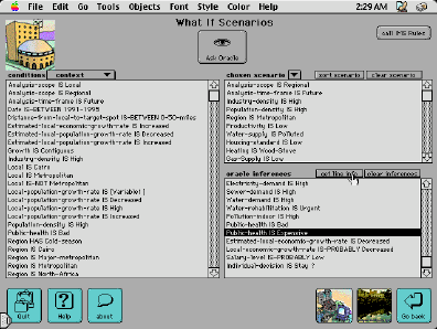 "Oracle Expert System Center", where users can build different hypothetical scenarios from sets of conditions and have the expert system infer the estimated consequences ("What If" questions), with the ability to check the reasoning (and the source) behind each inference;