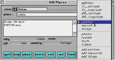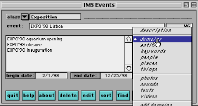 The left columns indicate the data classes that compose the relational model; the right columns indicate the corresponding software data base modules integrated in the prototype. The asterisk denotes a limited integration in the IMS. Although I programmed and tested the IMS GIS module (derived from my earlier work on geo-referenced browsers), it was not incorporated in the final prototype, mainly because of time constraints. Therefore, maps were treated as images.