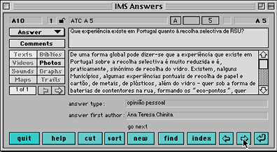 While we collected 453 answers, only 404 got inserted on time. Among the 404 answers to 314 questions (of the 445 questions compiled), the majority are direct references to the EIA; 90 of the Issues have answers from more than one person or entity, providing a large enough set for testing the effect of confronting different points of view for the same issue. Profiting from the multimedia data base smooth integration, these answers include references to 59 video segments, 150 images (among which more than a dozen maps) and 4 sound recordings. The complete list of the videos is included in the appendix, given its direct relevance in the powerful expression of the IMS.