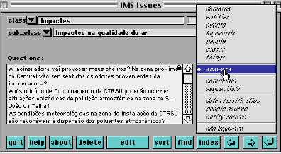 At the entry interface screen (see Fig. 5.11.2.-1) the user is presented with a choice of all the main functions the IMS offers: learn about the system (introduction), read the main documents for public consultation, ask questions, browse the information available, and eventually insert new information. The graphic design is also deliberate: the function access "buttons" demonstrate the use of translucency in interface design, and the background photograph pictures the heavily polluted river Trancão in Loures county, but up-river, before the pollution is visible, and offering a contrast that is a gentle reminder of what we have to gain by dealing properly with our waste.