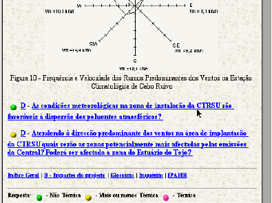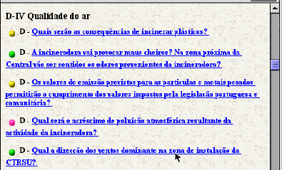 Besides facilitating access, compared to the need to take a trip to the municipality central office or to IPAMB, the advantage is twofold: first, the EIA can be consulted through questions structured according to the "Issue" taxonomy, which was adopted after careful and extensive debate; second, they provide the user with "FAQ Trails", sequences of question-answer pairs that made sense to read one after the other, and with "traffic light-like" flags (green, yellow, red) to warn in advance the user as to the technical level of difficulty of each one.