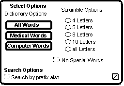 The Options View is used to set various options for the AMIGO program. Specifically, it is possible to select the dictionary used, the type of search to be performed, and options for the scramble puzzle. Click on the view above to learn more about the various AMIGO options that you can set. |
