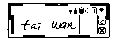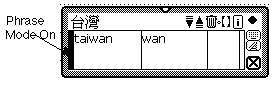 For example, if you turn on the 'Phrase Mode' (indicated by the tiny little black bar to the right of the input window), you begin by writing the first PinYin phonetic ('tai', here) in the first 'Input Window' (you'll always have to begin with the first one), and the second phonetic ('wan', here) in the second 'Input Window'. The input method engine will search the dictionary and show the corresponding phrase if it can find it (though not found in the United Nations!). The result is shown in the following figure,