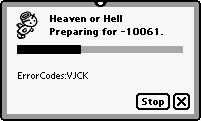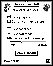 このソフト「Heaven or Hell」はNewton MessagePad 2100やアップデートしたMessagePad 2000、メモリ増設をしたeMate 300などで頻発するようになった-10061 Errorに対処するためのものです。このソフトをインストールすることで、-10061エラーが起こるのをかなりの確率で押さえることが可能です。 -10061エラーが起こったときにどうするか?というものではなく、基本的には予防するためのものです。定期的にシステムのチェックを行い、エラーを引き起こしそうな場所を見つけ、事前に修復します。 このソフトを入れたからといって、-10061エラーを完全に無くすことはできません。このエラーが起こるのは、明らかにOSのバグです。そのバグを直せるのはApple Computer, Inc.だけです。このエラーに関する詳しい情報は、Internet上のタコ部屋をごらんください。