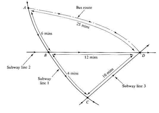 Headways between subways on all lines are exactly 10 minutes. Moreover, the subway schedules are coordinated so that a line 2 train to D passes through B exactly 4 minutes after a line 1 train has stopped at B. and similarly, a line 3 train to D passes through C exactly 4 minutes after a line 1 train has stopped at C. Assume that transfer times and stop time are negligible. Headways between buses at A are also constant and equal to 10 minutes.