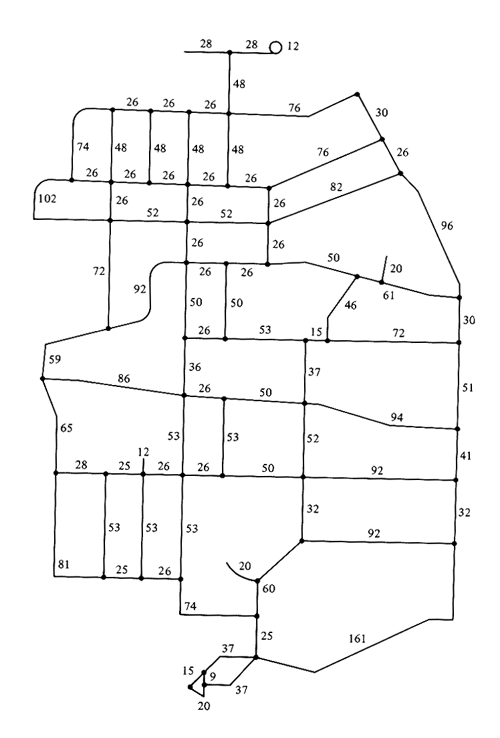 Z = Find the optimum road network for this case. (This is an example of "optimum network design," a class of difficult network problems.) 6.5 Solving the CPP on a city map It has been pointed out that good solutions to urban Chinese postman problems can usually be found quite easily, even for large networks, if a good map is available. The map of Figure P6.5 involves about 50 nodes and 90 arcs. It is based on a test problem due to P. Authier (University of Sherbrooke, Canada). There are 38 odd-degree nodes in the network (i.e., more than 1021 alternative matchings)! Solve the CPP for this network using Algorithm 6.5 and finding a matching of odd-degree nodes by inspection (plus trial and error). Make a photocopy of the map and indicate (by doubling lines in red pencil or in ink) the street segments that must be traversed twice in your solution. (A tour is required; distances are in tens of feet.) What is the total distance that will be traversed twice in your solution ? (In the optimal solution the answer is 8,360 feet, including the length of dead-end street-- which must be traversed twice anyway.) 6.6 Chinese postman problem on a directed network To solve