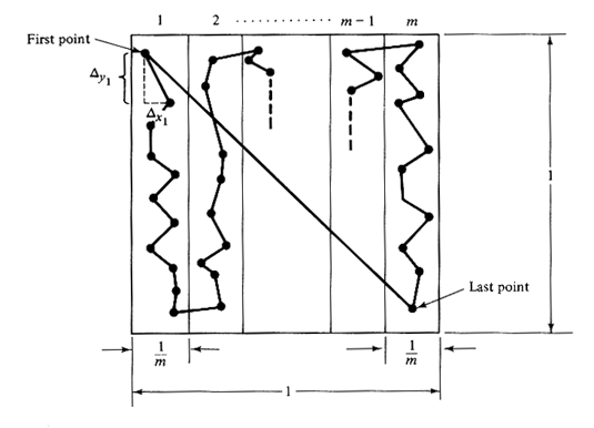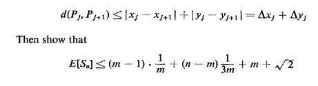 6.7 Upper bound on the expected length of the TST A total of n points are randomly and uniformly distributed within a unit square. We wish to obtain an upper bound on the expected length of the optimum traveling salesman tour, E[TST], through these n points. Suppose that we divide the unit square into m equal-width columns, as shown on Figure P6.7, where m is to be determined later. We visit all n points through the following strategy. We start from the point in the leftmost column having the largest y coordinate. We then visit the point in the same column having the next lower y coordinate, and so on. When we reach the lowest point in the first column, we next visit the lowest point in the second column and we then traverse the points in that column upward. We continue this process by visiting all columns from left to right, changing the direction of traversal at each column. To complete the tour, we join the last point to the first point with a straight line. Let Sn be a random variable denoting the length of this tour.