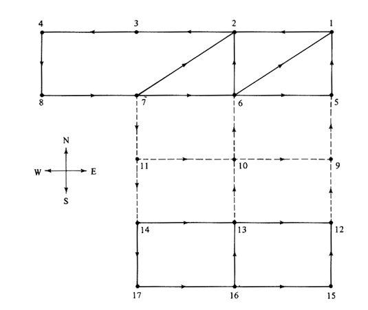 6.8 Coin collection from parking meters Figure P6.8 shows a section of a downtown area. A special coin-collection truck must traverse all street segments indicated with solid lines once a week, to collect coins deposited in parking meters by motorists. Parking meters exist on only one side of these streets. Street segments indicated by dashed lines do not have parking meters and therefore need not be traversed, except as necessary to travel between parts of the downtown street grid. Travel in all street segments is permitted in only one direction, as indicated by the arrows in Figure P6.8. An east-west block is 9 units long, and a north-south block is 6. Diagonal street segments are 11 units long. Note that there is no direct connection between points 3 and 7. What is the length of the shortest route that the truck can travel