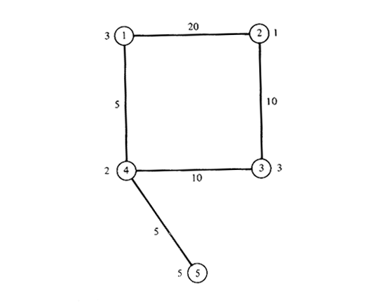 How is this problem different from the CPP on directed networks? Can you devise a systematic procedure for dealing with this family of problems ? 6.9 Proof of Hakimi's theorem Prove that "at least one set of k-medians exist solely on the nodes of a network G" (Section 6.5.2). The proof for k = 1 was given in Section 6.5.2. 6.10 Location of a "supporting facility" Consider the network of Figure P6.10 and imagine that the nodes represent five cities, the numbers next to the nodes the "weights" of the cities, and the numbers next to the links the mile length of roadways connecting the cities. Cars travel on the roadways at an effective speed of 30 mph. Assume that a major facility, say an airport, has been located at some point on this network. A regional planning group now wishes to install a high-speed transportation link to the airport with a single station. The high-speed vehicles will travel on the network at twice the speed of cars and their route will be the shortest route to the airport. It is assumed that travelers to the airport will choose that combination of transportation modes which minimizes their access time to the airport (ignoring transfer times). To clarify the description above, assume that the airport is at node 2