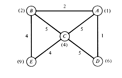 6.13 Facility location with congestion The network of Figure P6.13 represents five towns and the roadways connecting them. Emergency medical centers (one or more) are to be located in this area. The numbers in parentheses indicate the average number of calls for assistance generated per hour at each of the five towns. For each town the call-generating process can be considered Poisson and the process for each town is independent of that for all others. The numbers on the links of the network indicate the travel time, in minutes, for ambulances traveling that link (we assume that travel times within the towns are equal to 0).