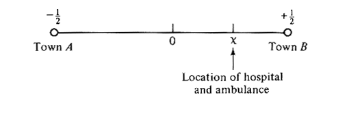 A hospital equipped with a single ambulance is located at some point between the two towns which is a distance x away from the halfway point between the two towns.