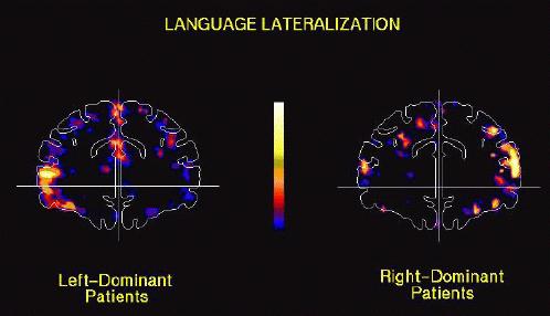 In this study the use of functional MRI (fMRI) for measuring language lateralization non-invasively was examined. The subjects were seven patients with histories of temporal lobe epilepsy who had undergone Wada testing for pre-surgical evaluation. Four patients were left-hemisphere-dominant and three were right-hemisphere-dominant for language. They received fMRI scans while they made semantic or perceptual judgments about visually presented words. Regions of the inferior frontal gyrus (pars triangularis and pars orbitalis) and neighboring orbital cortex, corresponding to portions of Brodmann areas 45, 46, and 47, exhibited significant increases in activation during semantic relative to perceptual judgments. Lateralization of the increases in activation were consistent with the Wada test assessments of hemispheric language dominance in each of the seven patients. These results suggest that, in addition to providing a tool for investigating human cognitive processes, fMRI has significant clinical potential as a non-invasive measure of language lateralization.