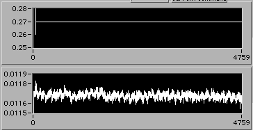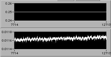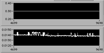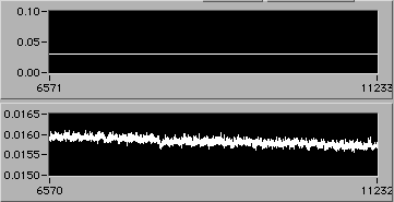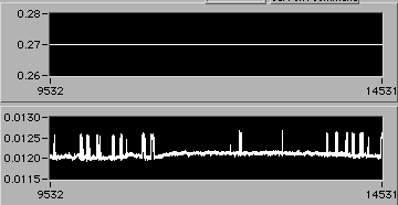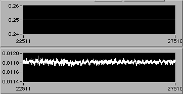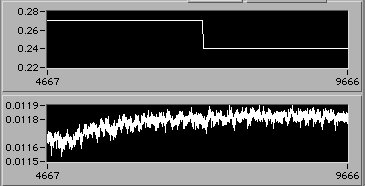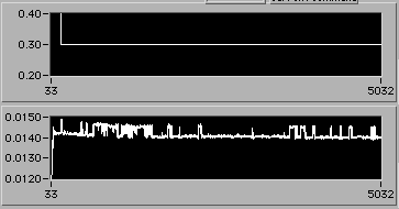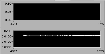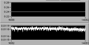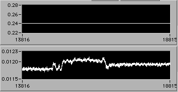 e=0.022 | 0054 hrs 15 Apr. Stress is about 14 MPa (stress = 0 corresponds to 0.005 V on lower chart). |