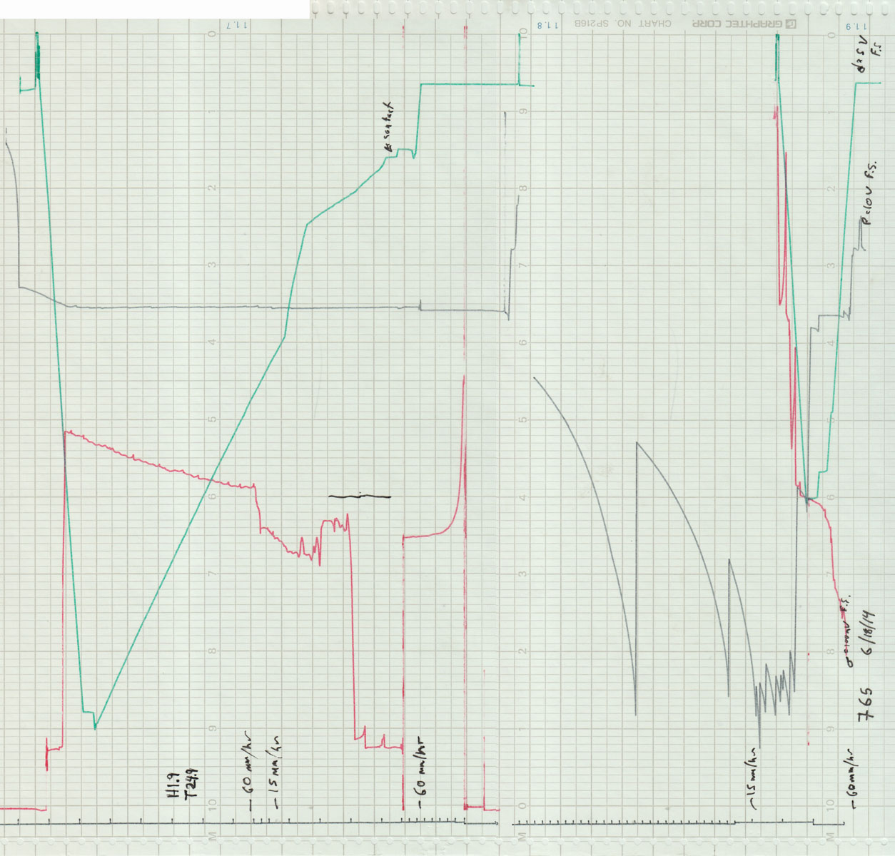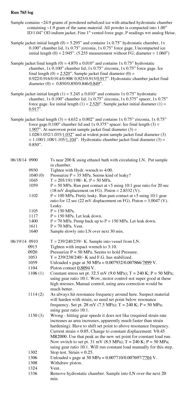 Legend: Upper graph of each pair is motor speed V (proportional to edot); lower graph is load (in volts). Translate motor V to edot thus: V1.00 ≈ 6e-6/s ≈ 2%/hr. Load to stress translation for ice767 is roughly ____ MPa/mV, with a __ mV zero offset. Horizontal scale is time. 5000 ≈ 14 hrs. | ||||