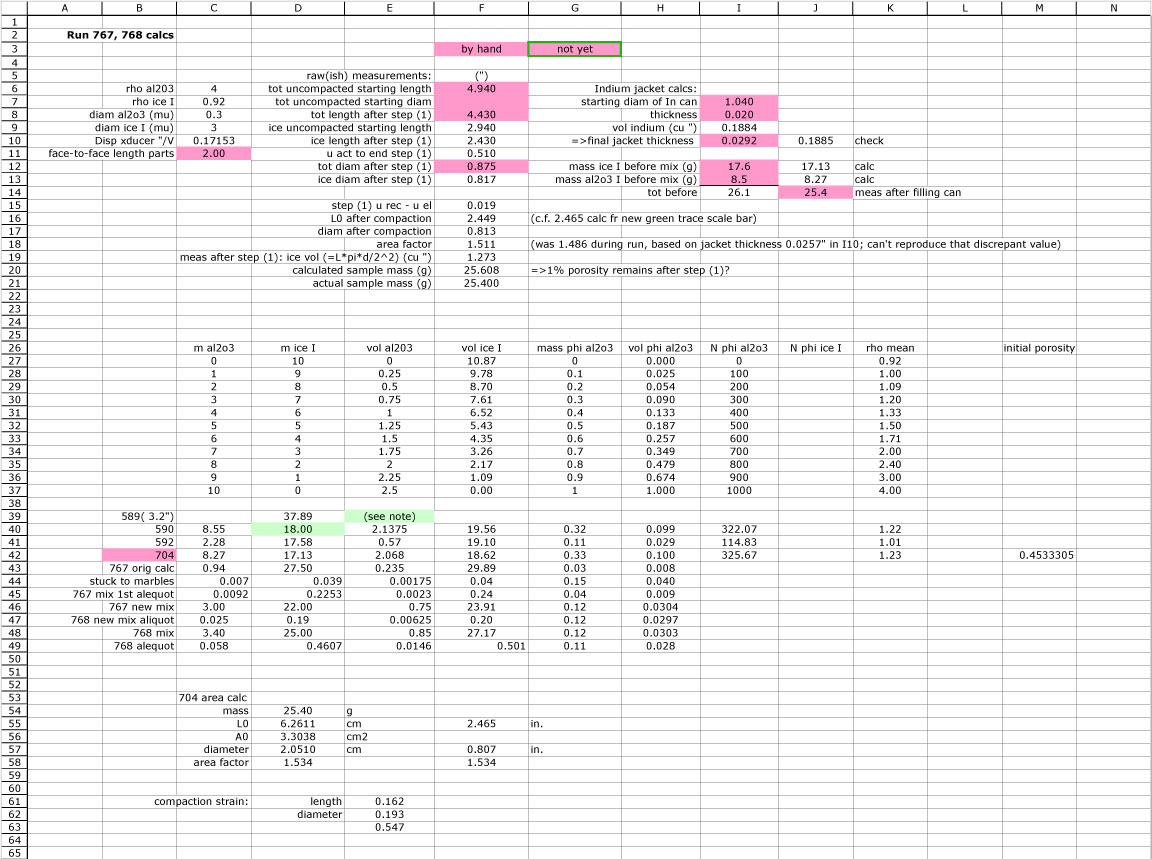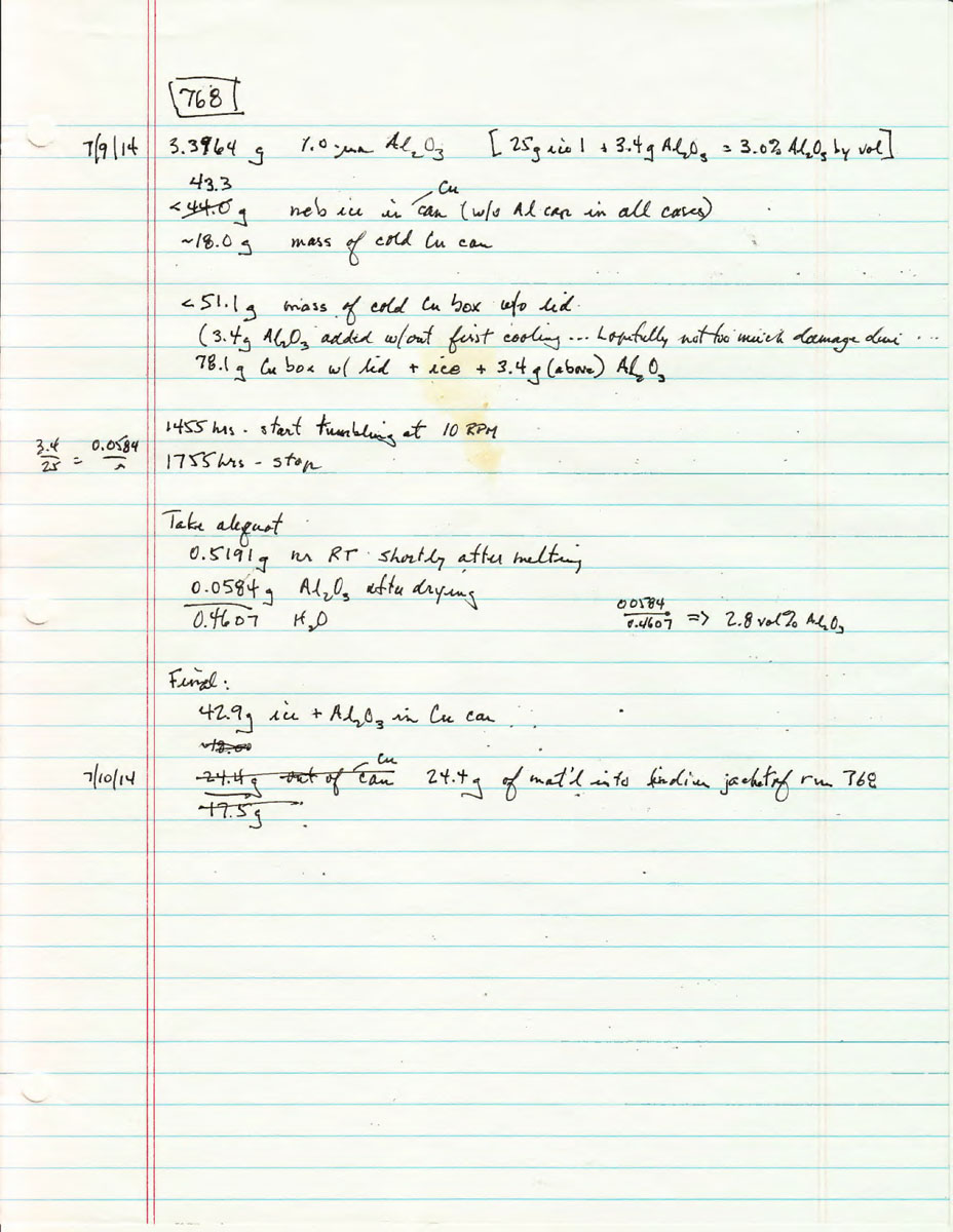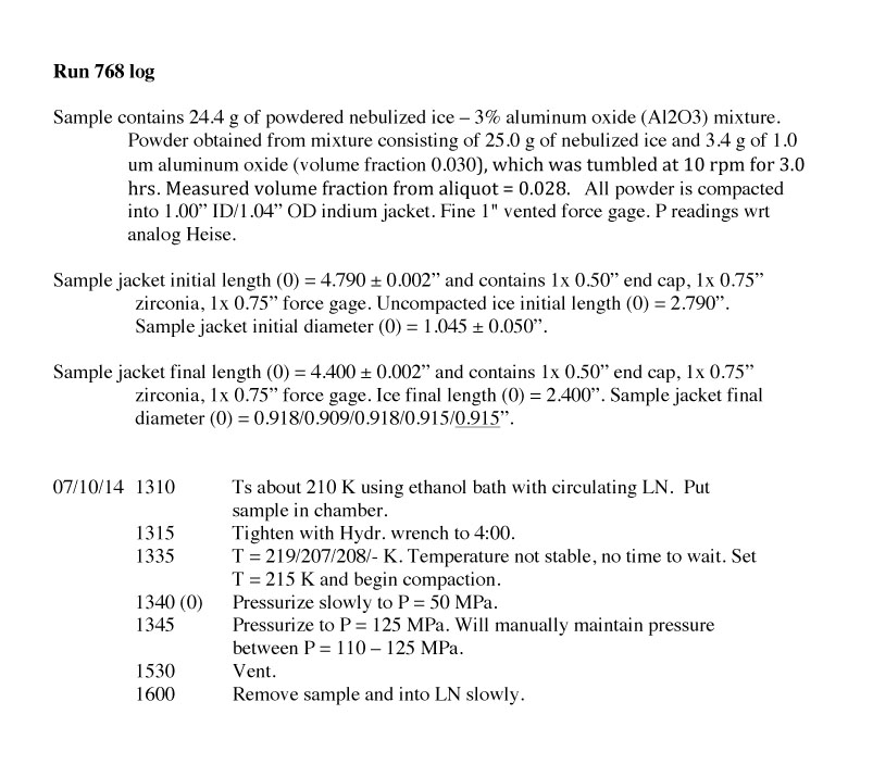 Ice768 (NG74): nebulized f.g. ice I + 3% by vol 1-micron Al2O3, mixed by motorized tumbling