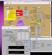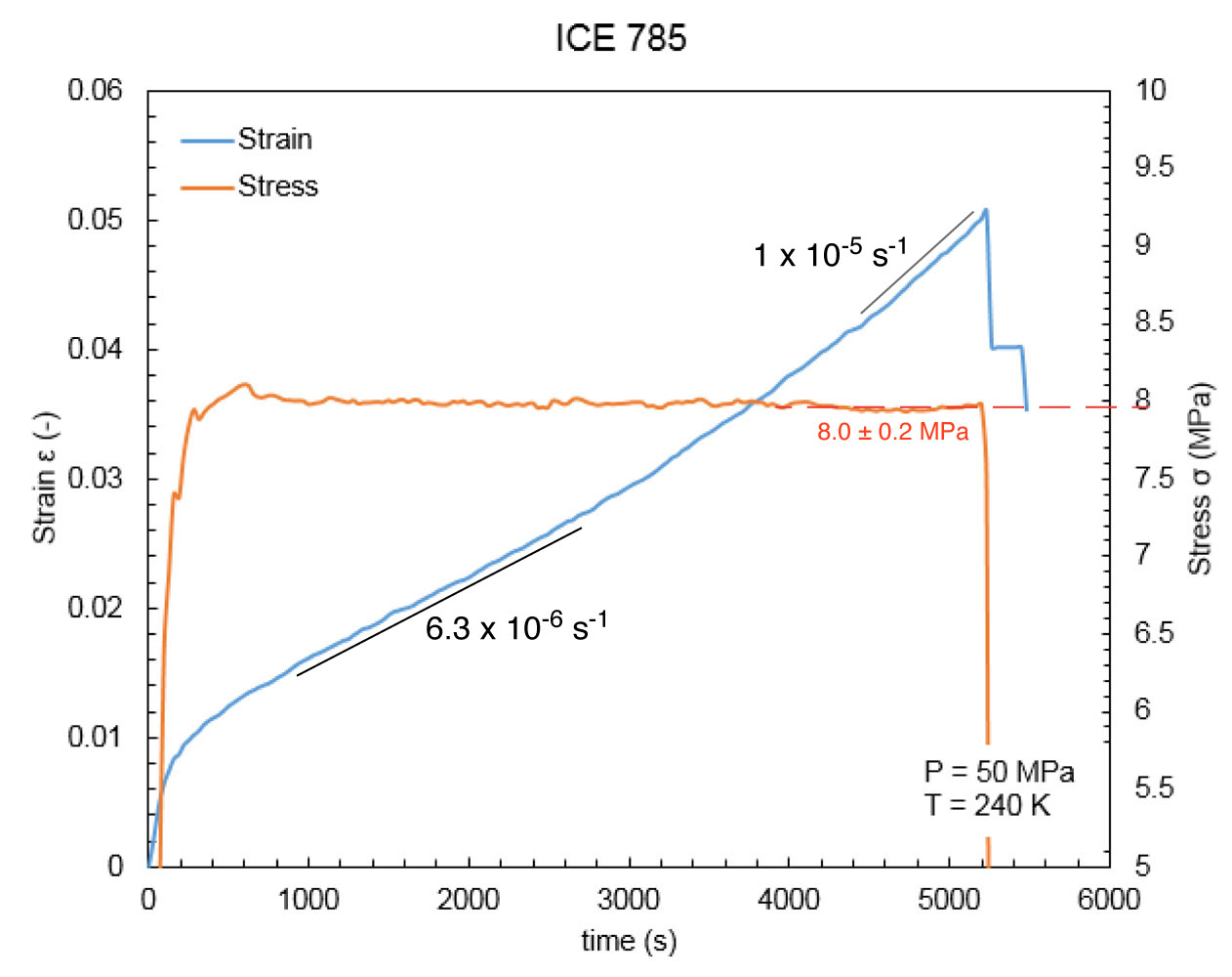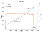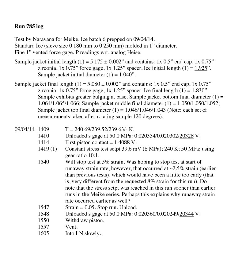 Legend: Upper graph of each pair is motor speed V (proportional to edot); lower graph is load (in volts). Translate motor V to edot thus: V1.00 ≈ 6e-6/s ≈ 2%/hr. Load to stress translation for ice ___is roughly ___ MPa/mV, with a __mV zero offset. Horizontal scale is time. 5000 ≈ 14 hrs.
