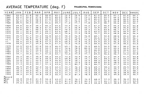 The Appalachian Mountains to the west and the Atlantic Ocean to the east has a moderating effect on climate in the Philadelphia region. Periods of very high or very low temperature seldom last for more than three or four days. Temperatures below zero or above 100 degrees are a rarity. On occasion, the area becomes engulfed with maritime air during the summer months, and high humidity adds to the discomfort of seasonably warm temperatures.