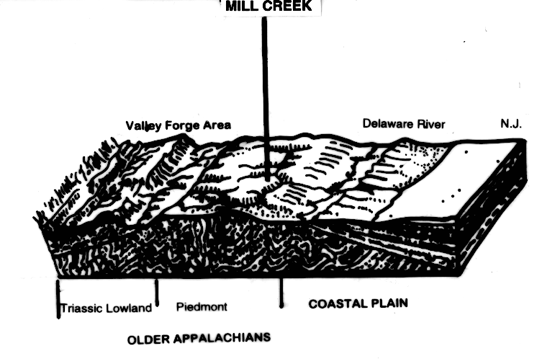 Mill Creek lies on a wide, gentle, eastern-facing slope of Pennsylvania's "Piedmont" mountain formation. Piedmont is composed mainly of schist and phyllite--rocks that were once part of sea-floor muds but which have been compressed and folded over the early North American continent to produce mountains. Schist is a hard rock that contains many good minerals necessary for plants, but because of its strength releases them only slowly over time as an effect of weathering and erosion. |