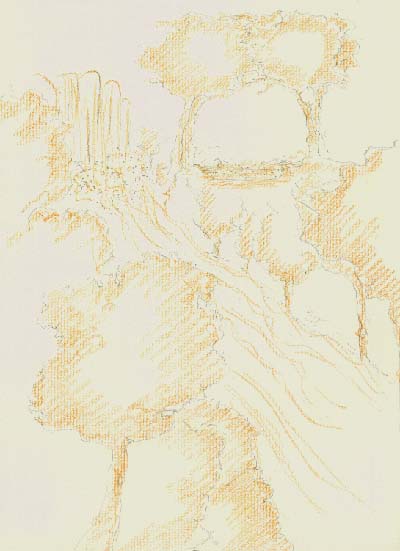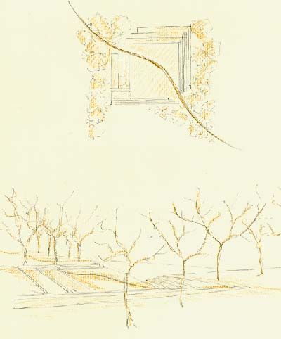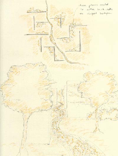 park: thick vegetation flanking the river. The third suggestion could be a synthesis of the first two. Mill Creek could flow either on the surface or underneath it. Underground water would be characterized by its constant speed , while on the surface it would rest and fill some kinds of pond in strategic plots. In this case there would be two different moments interpreted by two different "architectures". I will suppose that water flows on an artificial streambed clearly designed by men: when it is dried , it resembles a mineral landscape where order dominates; when it rains, and the sewer will not support the rate of flow, water expands into designed beds so turning the environment into an informal and organic landscape. In this way, the landscape would be characterized by a changeable quality and it would never be monotonous: therefore celebration of water and life would take place. |